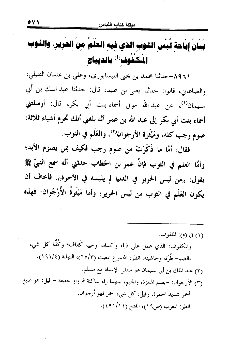 8961 - حدثنا محمد بن يحيى النيسابوري، وعلي بن عثمان النفيلي، والصاغاني، قالوا: حدثنا يعلى بن عبيد، قال: حدثنا عبد اللك بن أبي سليمان (¬1)، عن عبد الله مولى أسماء بنت أبي بكر، قال: أرسلتني أسماء بنت أبي بكر إلى عبد الله بن عمر أنَّه بلغني أنك تحرم أشياء ثلاثة: صوم رجب كله، ومَيْثَرة الأرجوان (¬2)، والعَلَم في الثوب.