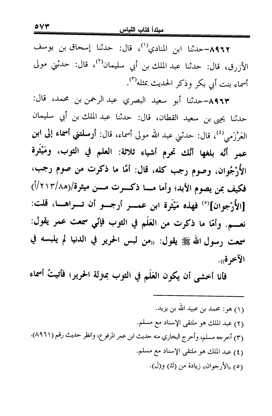 8963 - حدثنا أبو سعيد البصري عبد الرحمن بن محمد، قال: حدثنا يحيى بن سعيد القطان، قال: حدثنا عبد الملك بن أبي سليمان العَرْزَمي (¬1)، قال: حدثني عبد الله مولى أسماء، قال: أرسلتني أسماء إلى ابن عمر أنَّه بلغها أنَّك تحرم أشياء ثلاثة: العلم في الثوب، ومَيثَرة الأُرْجُوان، وصوم رجب كله، قال: أمَّا ما ذكرت من صوم رجب، فكيف بمن يصوم الأبد؛ وأما ما ذكرت من ميثرة [الأُرْجوان] (¬2) فهذه مَيْثَرة ابن عمر أرجو أن تراها، قلت: نعم. وأمّا ما ذكرت من العَلَم في الثوب فإنّي سمعت عمر يقول: سمعت رسول الله -صلى الله عليه وسلم- يقول: "من لبس الحرير في الدنيا لم يلبسه في الآخرة". فأنا أخشى أن يكون العَلَم في الثوب بمنزلة الحرير؛ فأتيتُ أسماء