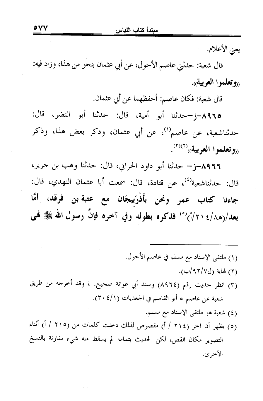 8965 - ز- حدثنا أبو أمية، قال: حدثنا أبو النضر، قال: حدثنا شعبة، عن عاصم (¬1)، عن أبي عثمان، وذكر بعض هذا، وذكر "وتعلموا العربية" (¬2) (¬3).