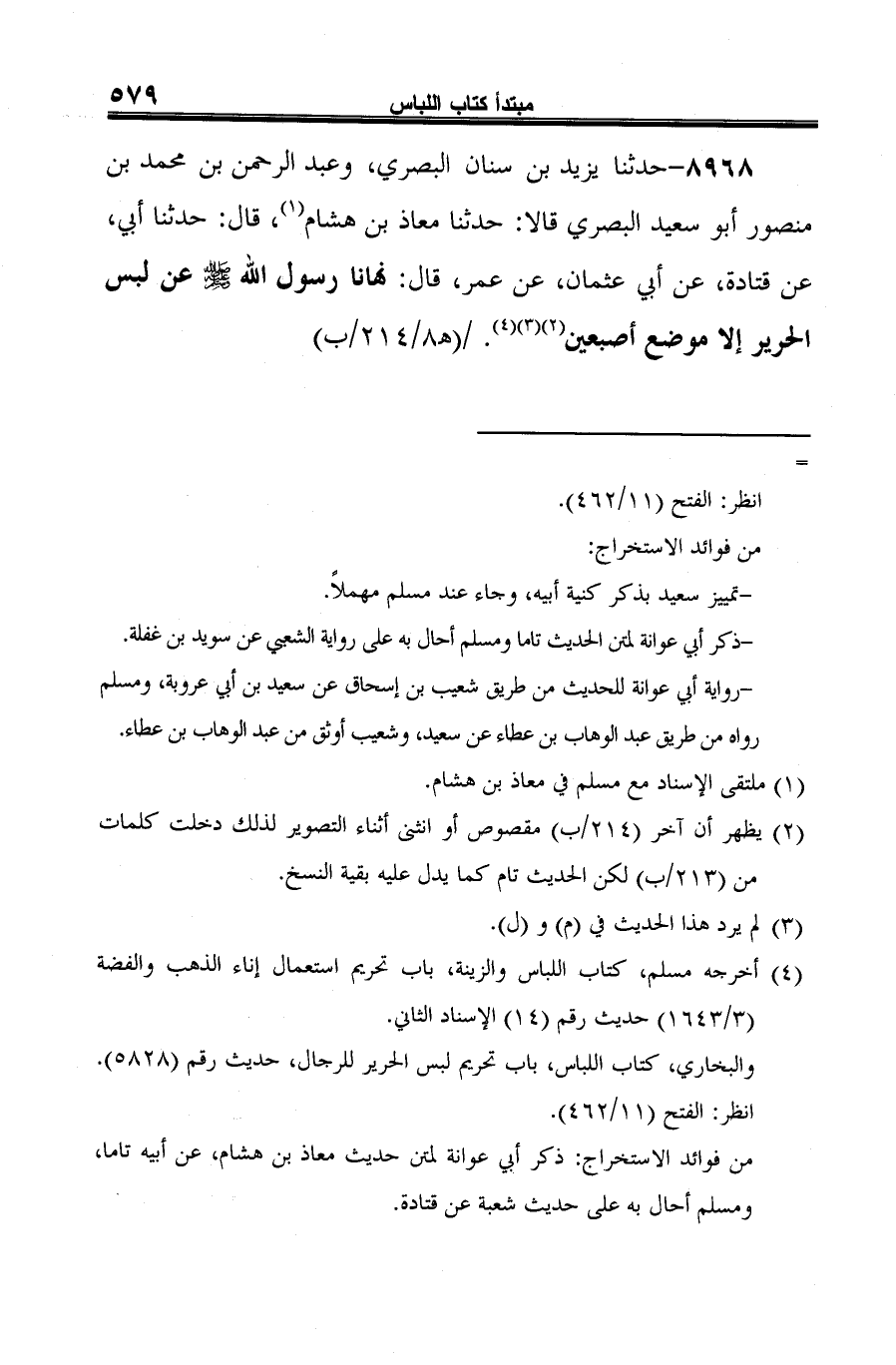 8968 - حدثنا يزيد بن سنان البصري، وعبد الرحمن بن محمد بن منصور أبو سعيد البصري قالا: حدثنا معاذ بن هشام (¬1)، قال: حدثنا أبي، عن قتادة، عن أبي عثمان، عن عمر، قال: نهانا رسول الله -صلى الله عليه وسلم- عن لبس الحرير إلا موضع أصبعين (¬2) (¬3) (¬4).