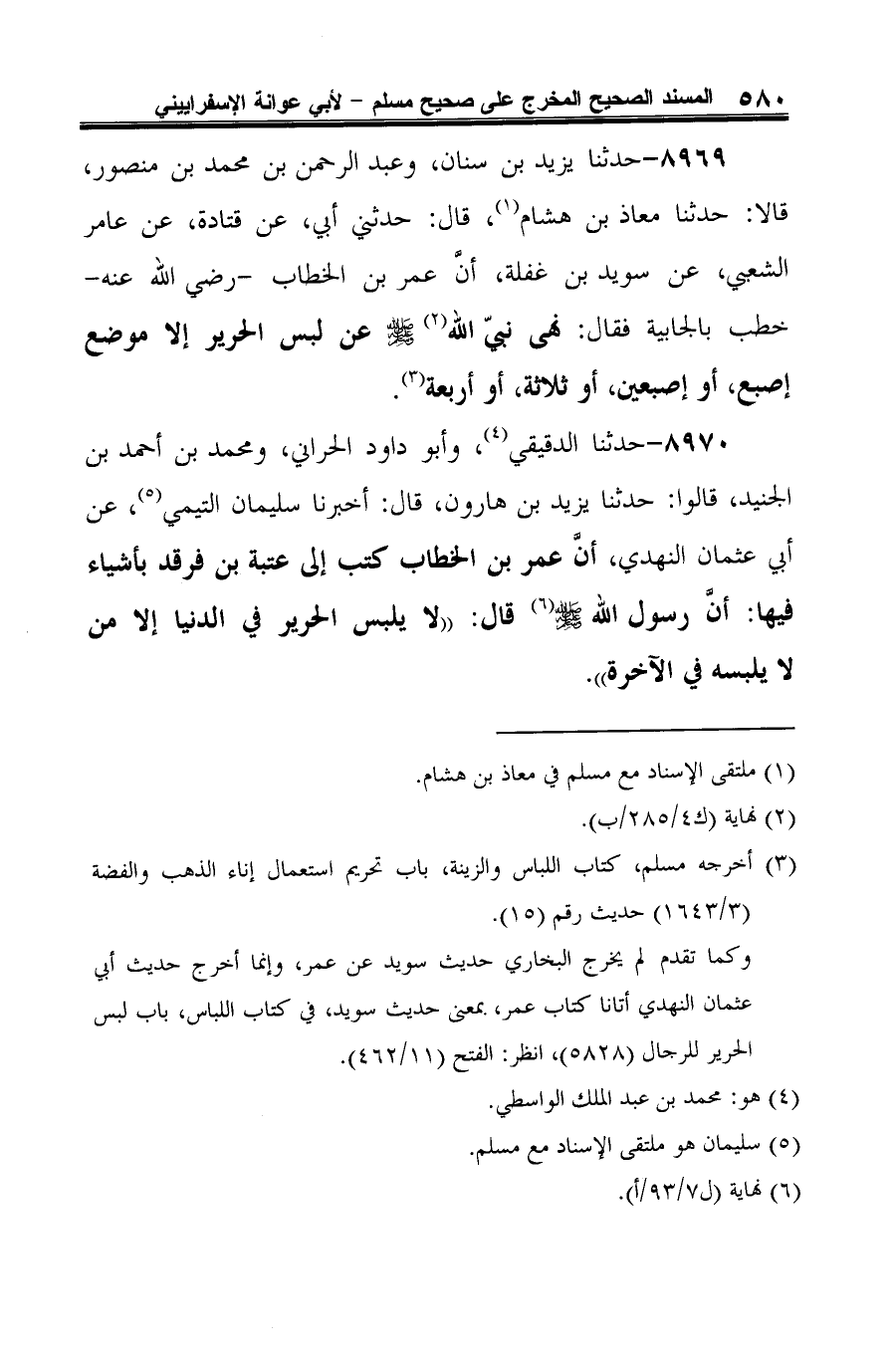 8970 - حدثنا الدقيقي (¬1)، وأبو داود الحراني، ومحمد بن أحمد بن الجنيد، قالوا: حدثنا يزيد بن هارون، قال: أخبرنا سليمان التيمي (¬2)، عن أبي عثمان النهدي، أن عمر بن الخطاب كتب إلى عتبة بن فرقد بأشياء فيها: أنَّ رسول الله -صلى الله عليه وسلم- (¬3) قال: "لا يلبس الحرير في الدنيا إلا من لا يلبسه في الآخرة".