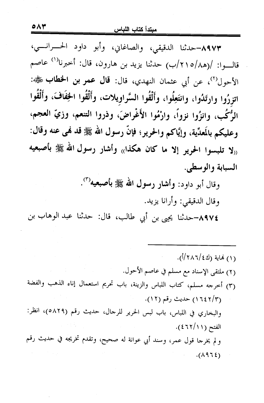8973 - حدثنا الدقيقي، والصاغاني، وأبو داود الحراني، قالوا: حدثنا يزيد بن هارون، قال: أخبرنا (¬1) عاصم الأحول (¬2)، عن أبي عثمان النهدي، قال: قال عمر بن الخطاب -رضي الله عنه-: اتزِرُوا وارتَدُوا، وانتَعِلُوا، وأَلْقُوا السَّراوِيلات، وأَلْقوا الحفَافَ، وأَلْقوا الرُّكُب، وانزُوا نزوًا، وارْمُوا الأَغْراضَ، وذروا التنعم، وزيّ العجم، وعليكم بالمَعدِّية، وإيَّاكم والحرير؛ فإنّ رسول الله -صلى الله عليه وسلم- قد نهى عنه وقال: "لا تلبسوا الحرير إلا ما كان هكذا" وأشار رسول الله -صلى الله عليه وسلم- بأصبعيه السبابة والوسطى.