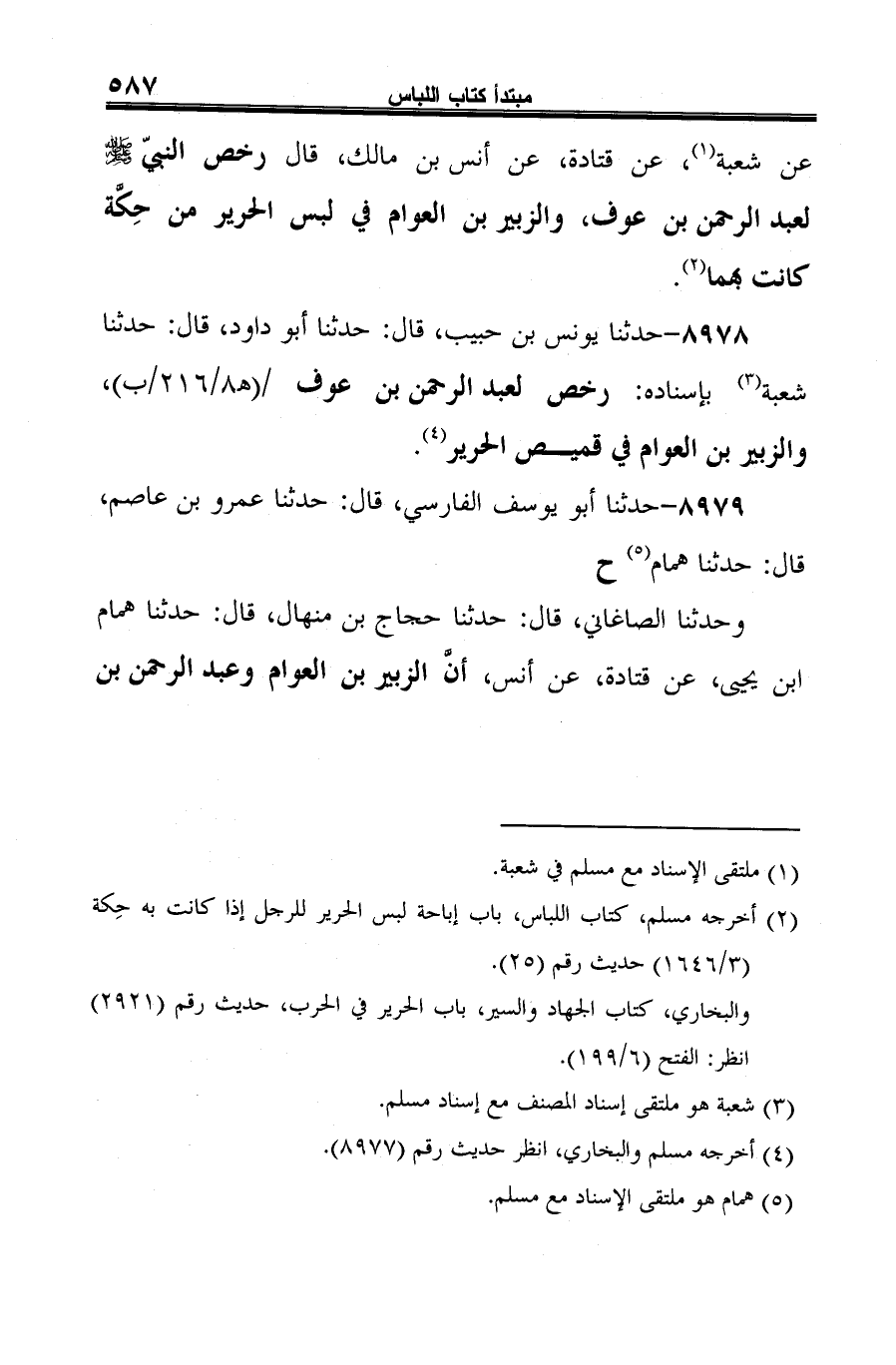 وحدثنا الصاغاني، قال: حدثنا حجاج بن منهال، قال: حدثنا همام ابن يحيى، عن قتادة، عن أنس، أن الزبير بن العوام وعبد الرحمن بن