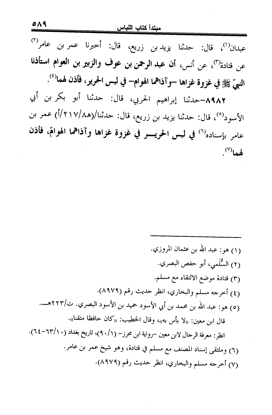 8982 - حدثنا إبراهيم الحربي، قال: حدثنا أبو بكر بن أبي الأسود (¬1)، قال: حدثنا يزيد بن زريع، قال: حدثنا عمر بن عامر بإسناده (¬2) في لبس الحرير في غزوة غزاها وآذاهما الهوامّ، فأذن لهما (¬3).