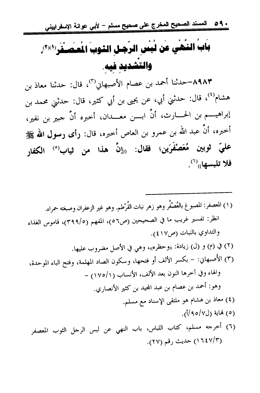 8983 - حدثنا أحمد بن عصام الأصبهاني (¬1)، قال: حدثنا معاذ بن هشام (¬2)، قال: حدثني أبي، عن يحيى بن أبي كثير، قال: حدثني محمد بن إبراهيم بن الحارث، أن ابن معدان، أخبره أنَّ جبير بن نفير، أخبره، أنَّ عبد الله بن عمرو بن العاص أخبره، قال: رأى رسول الله -صلى الله عليه وسلم- عليّ ثوبين مُعَصْفَرَين؛ فقال: "إنَّ هذا من ثياب (¬3) الكفار فلا تلبسها" (¬4).