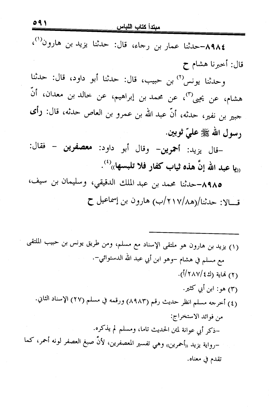 وحدثنا يونس (¬2) بن حبيب، قال: حدثنا أبو داود، قال: حدثنا هشام، عن يحيى (¬3)، عن محمد بن إبراهيم، عن خالد بن معدان، أنّ جبير بن نفير، حدثه، أنّ عبد الله بن عمرو بن العاص حدثه، قال: رأى رسول الله -صلى الله عليه وسلم- عليّ ثوبين.