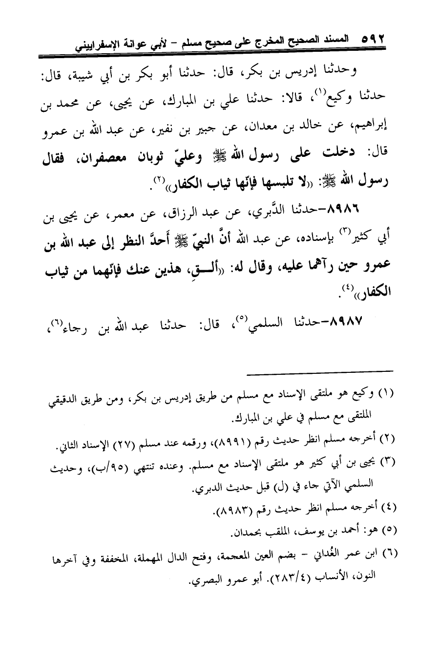 8986 - حدثنا الدَّبري، عن عبد الرزاق، عن معمر، عن يحيى بن أبي كثير (¬1) بإسناده، عن عبد الله أن النبيّ -صلى الله عليه وسلم- أَحدَّ النظر إلى عبد الله بن عمرو حين رآهما عليه، وقال له: "ألقِ، هذين عنك فإنّهما من ثياب الكفار" (¬2).