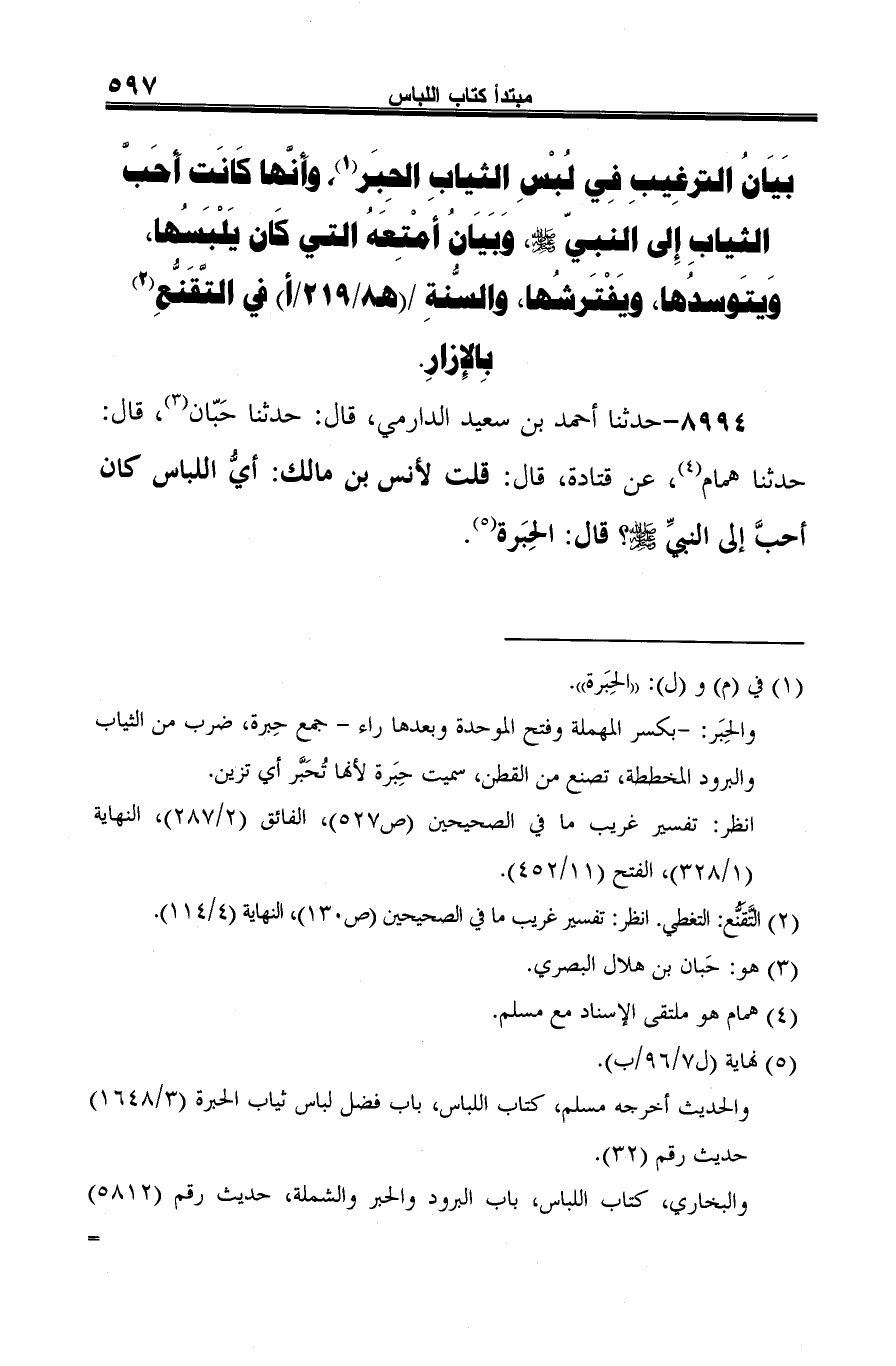 8994 - حدثنا أحمد بن سعيد الدارمي، قال: حدثنا حَبّان (¬1)، قال: حدثنا همام (¬2)، عن قتادة، قال: قلت لأنس بن مالك: أيُّ اللباس كان أحبَّ إلى النبيِّ -صلى الله عليه وسلم-؟ قال: الحِبَرة (¬3).