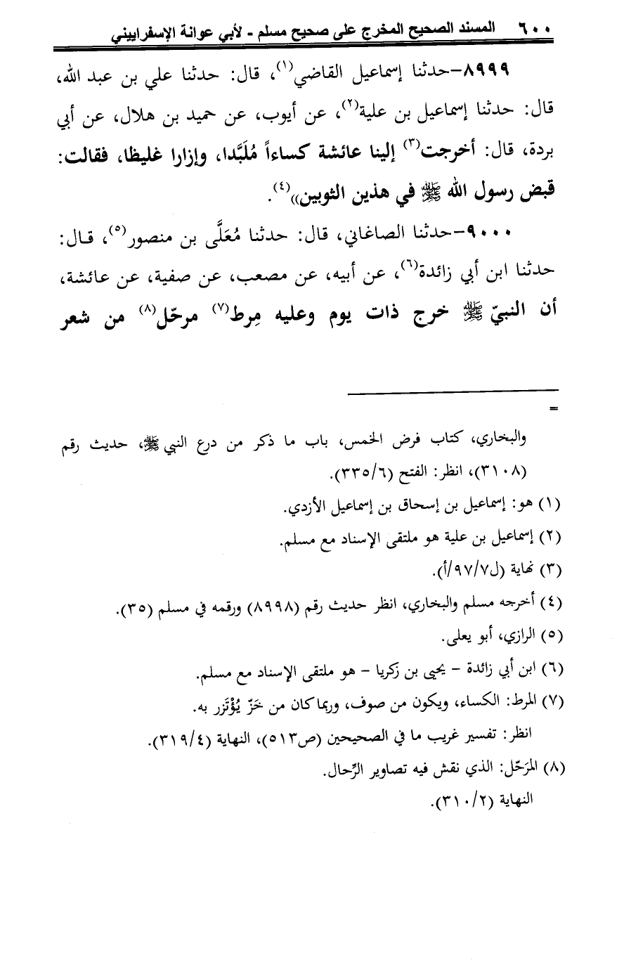9000 - حدثنا الصاغاني، قال: حدثنا مُعَلَّى بن منصور (¬1)، قال: حدثنا ابن أبي زائدة (¬2)، عن أبيه، عن مصعب، عن صفية، عن عائشة، أن النبيّ -صلى الله عليه وسلم- خرج ذات يوم وعليه مِرط (¬3) مرحّل (¬4) من شعر