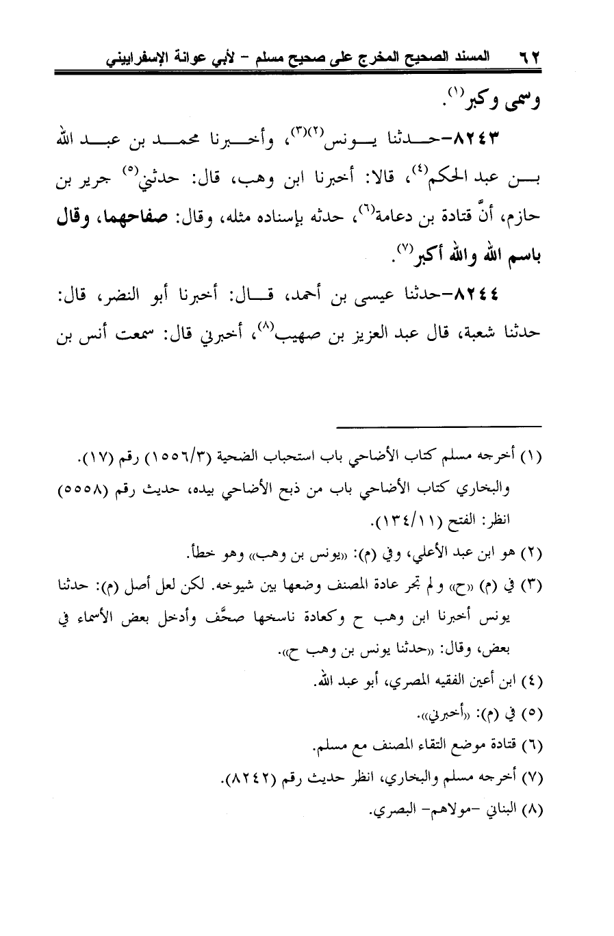 8243 - حدثنا يونس (¬1) (¬2)، وأخبرنا محمد بن عبد الله بن عبد الحكم (¬3)، قالا: أخبرنا ابن وهب، قال: حدثني (¬4) جرير بن حازم، أنَّ قتادة بن دعامة (¬5)، حدثه بإسناده مثله، وقال: صفاحهما، وقال باسم الله والله أكبر (¬6).