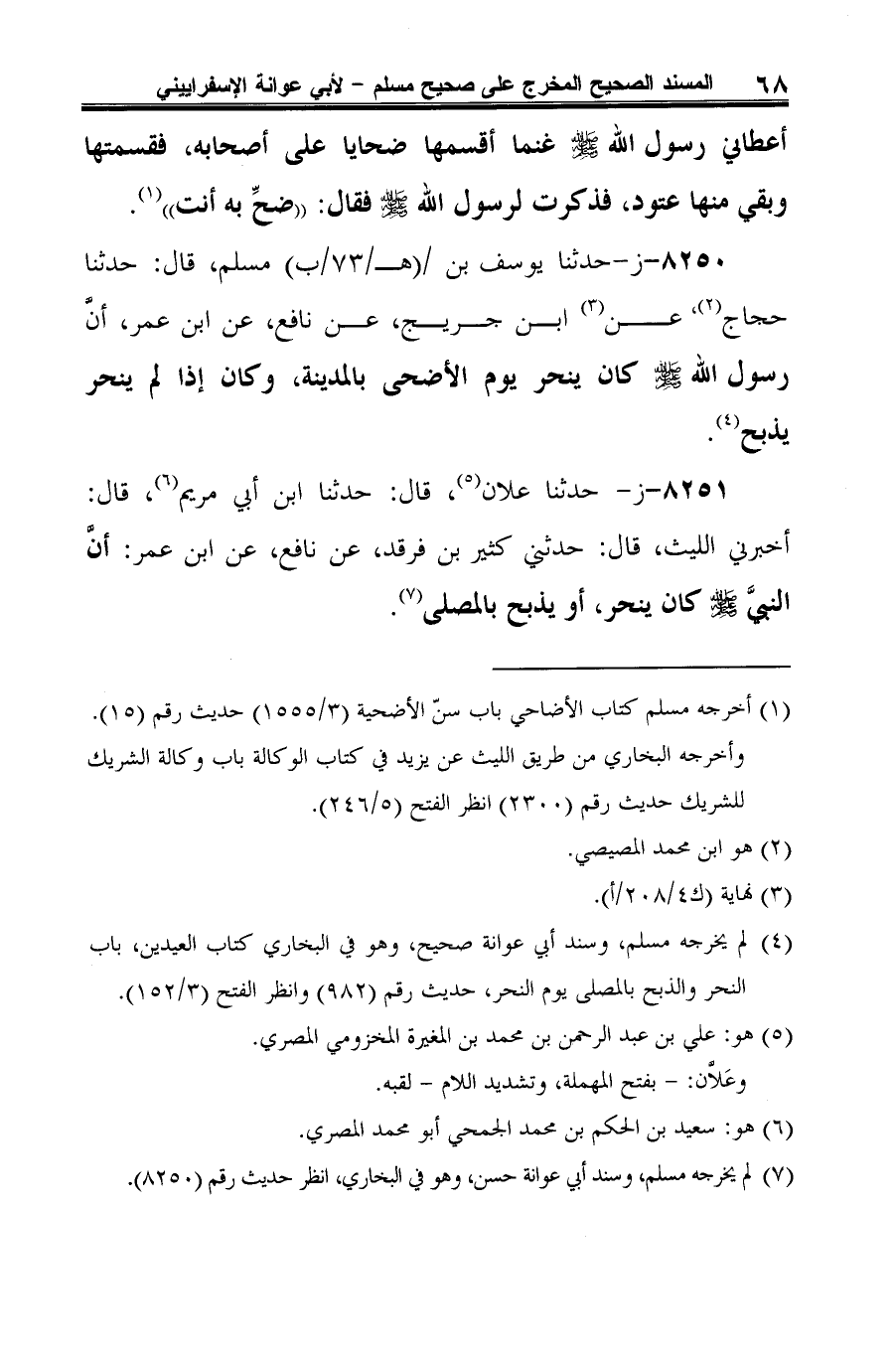 (¬3) لم يخرجه مسلم، وسند أبي عوانة صحيح، وهو في البخاري كتاب العيدين، باب النحر والذبح بالمصلى يوم النحر، حديث رقم (982) وانظر الفتح (3/ 152).