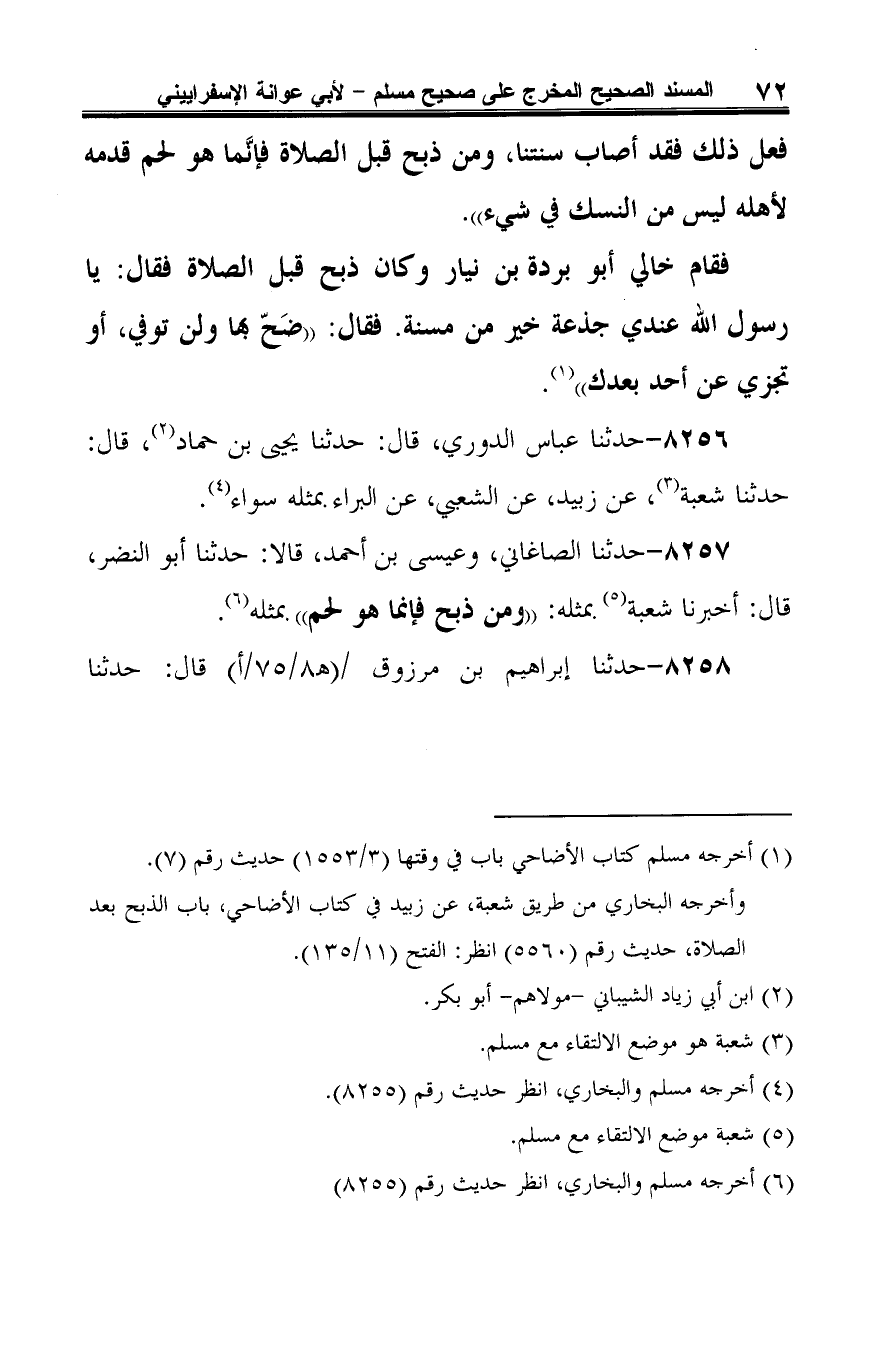 8257 - حدثنا الصاغاني، وعيسى بن أحمد، قالا: حدثنا أبو النضر، قال: أخبرنا شعبة (¬1) بمثله: "ومن ذبح فإنما هو لحم" بمثله (¬2).