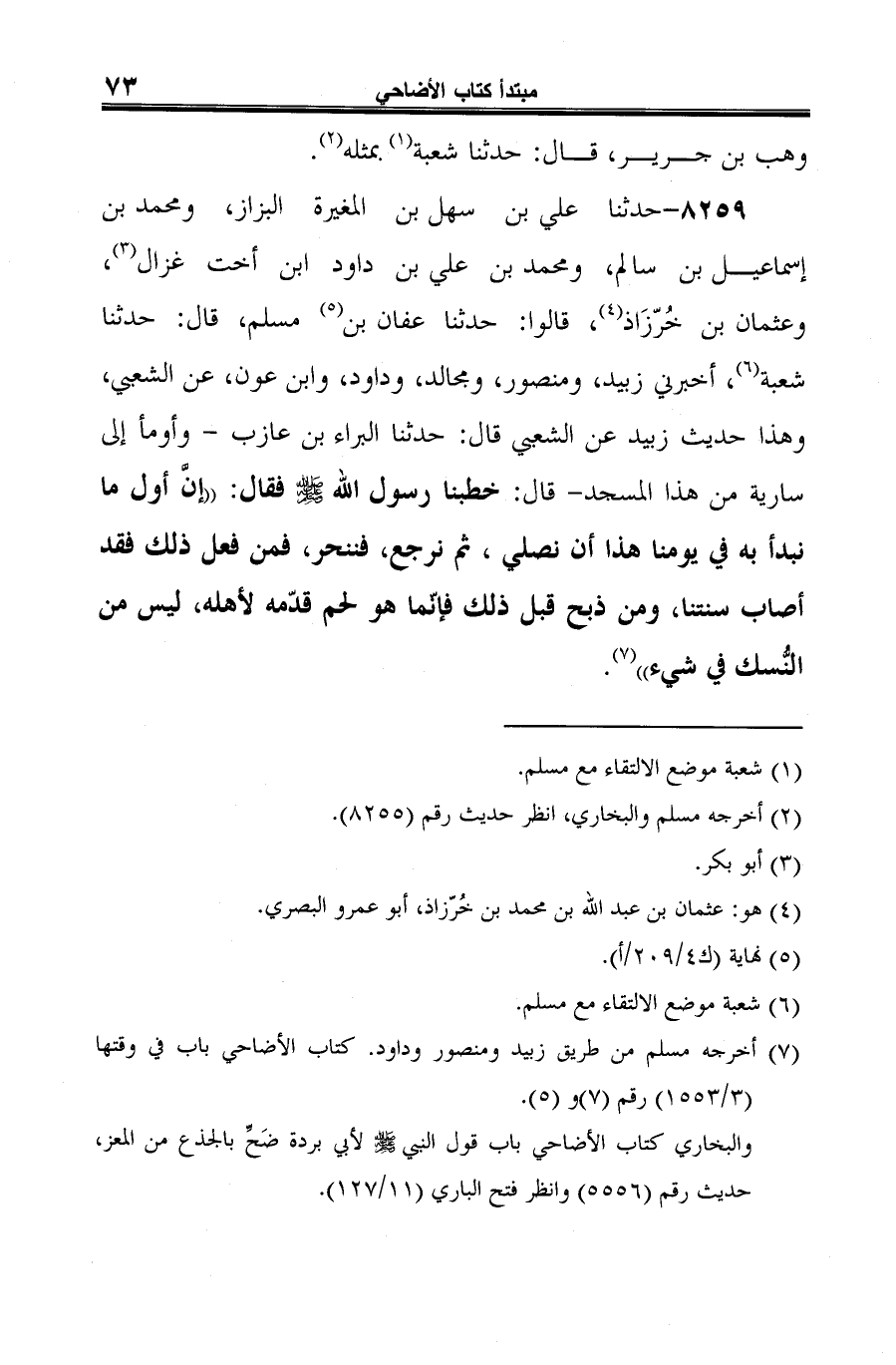8259 - حدثنا علي بن سهل بن المغيرة البزاز، ومحمد بن إسماعيل بن سالم، ومحمد بن علي بن داود ابن أخت غزال (¬1)، وعثمان بن خُرّزَاذ (¬2)، قالوا: حدثنا عفان بن (¬3) مسلم، قال: حدثنا شعبة (¬4)، أخبرني زبيد، ومنصور، ومجالد، وداود، وابن عون، عن الشعبي، وهذا حديث زبيد عن الشعبي قال: حدثنا البراء بن عازب -وأومأ إلى سارية من هذا المسجد- قال: خطبنا رسول الله -صلى الله عليه وسلم- فقال: "إنَّ أول ما نبدأ به في يومنا هذا أن نصلي، ثم نرجع، فننحر، فمن فعل ذلك فقد أصاب سنتنا، ومن ذبح قبل ذلك فإنَّما هو لحم قدّمه لأهله، ليس من النُّسك في شيء" (¬5).