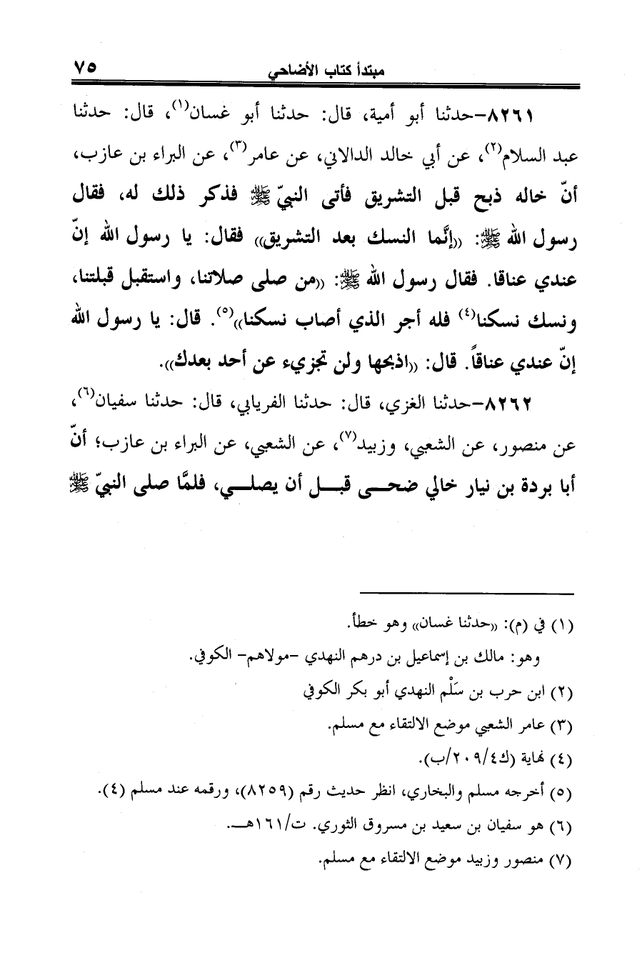 8262 - حدثنا الغزي، قال: حدثنا الفريابي، قال: حدثنا سفيان (¬1)، عن منصور، عن الشعبي، وزبيد (¬2)، عن الشعبي، عن البراء بن عازب؛ أنّ أبا بردة بن نيار خالي ضحى قبل أن يصلي، فلمَّا صلى النبيّ -صلى الله عليه وسلم-