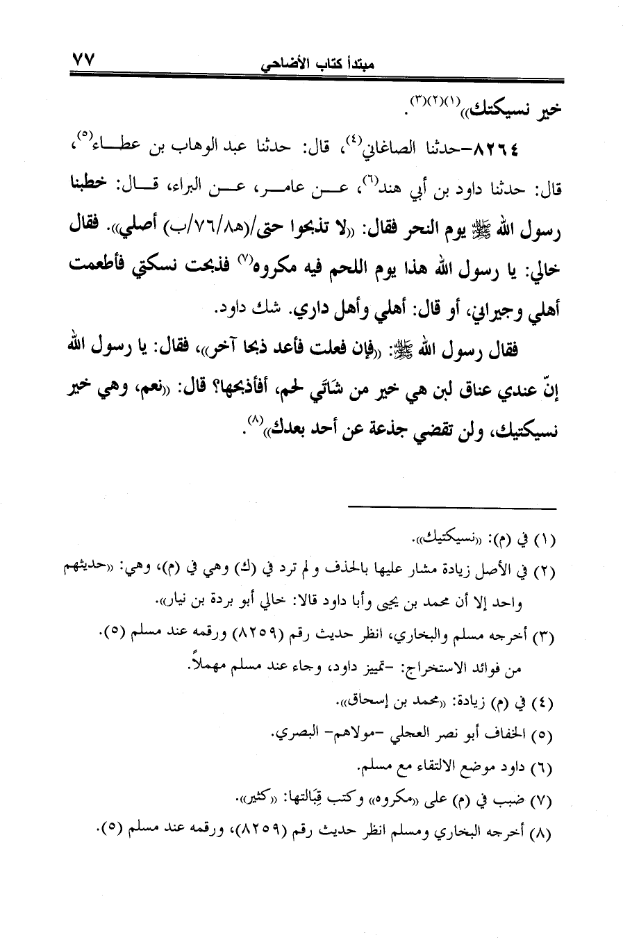 8264 - حدثنا الصاغاني (¬1)، قال: حدثنا عبد الوهاب بن عطاء (¬2)، قال: حدثنا داود بن أبي هند (¬3)، عن عامر، عن البراء، قال: خطبنا رسول الله -صلى الله عليه وسلم- يوم النحر فقال: "لا تذبحوا حتى أصلي". فقال خالي: يا رسول الله هذا يوم اللحم فيه مكروه (¬4) فذبحت نسكتي فأطعمت أهلي وجيراني، أو قال: أهلي وأهل داري. شك داود.