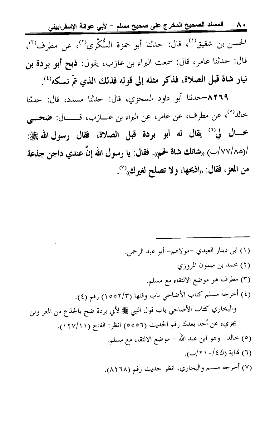 8269 - حدثنا أبو داود السجزي، قال: حدثنا مسدد، قال: حدثنا خالد (¬1)، عن مطرف، عن عامر، عن البراء بن عازب، قال: ضحى خال لي (¬2) يقال له أبو بردة قبل الصلاة، فقال رسول الله -صلى الله عليه وسلم-: "شاتك شاة لحم". فقال: يا رسول الله إنَّ عندي داجن جذعة من المعز، فقال: "اذبحها، ولا تصلح لغيرك" (¬3).