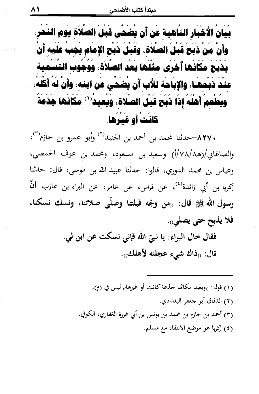 8270 - حدثنا محمد بن أحمد بن الجنيد (¬1) وأبو عمرو بن حازم (¬2)، والصاغاني وسعيد بن مسعود، ومحمد بن عوف الحمصي، وعباس بن محمد الدوري، قالوا: حدثنا عبيد الله بن موسى، قال: حدثنا زكريا بن أبي زائدة (¬3)، عن فراس، عن عامر، عن البراء بن عازب أنَّ رسول الله -صلى الله عليه وسلم- قال: "من وجّه قبلتنا وصلّى صلاتنا، ونسك نسكنا، فلا يذبح حتى يصلي".