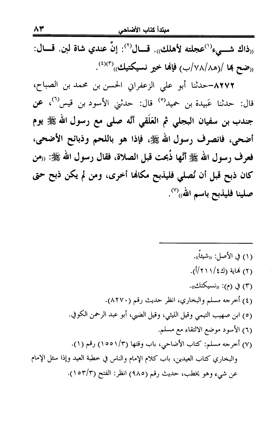 8272 - حدثنا أبو علي الزعفراني الحسن بن محمد بن الصباح، قال: حدثنا عَبيدة بن حميد (¬1) قال: حدثني الأسود بن قيس (¬2)، عن جندب بن سفيان البجلي ثم العَلَقي أنَّه صلى مع رسول الله -صلى الله عليه وسلم- يوم أضحى، فانصرف رسول الله -صلى الله عليه وسلم-، فإذا هو باللحم وذبائح الأضحى، فعرف رسول الله -صلى الله عليه وسلم- أنَّها ذُبحت قبل الصلاة، فقال رسول الله -صلى الله عليه وسلم-: "من كان ذبح قبل أن نُصلي فليذبح مكانها أخرى، ومن لم يكن ذبح حتى صلينا فليذبح باسم الله" (¬3).