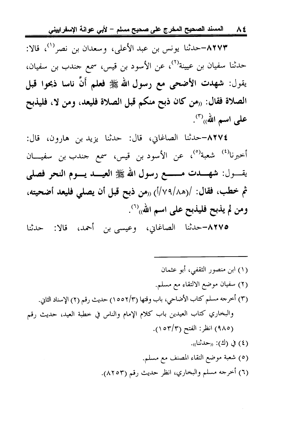 8273 - حدثنا يونس بن عبد الأعلى، وسعدان بن نصر (¬1)، قالا: حدثنا سفيان بن عيينة (¬2)، عن الأسود بن قيس، سمع جندب بن سفيان، يقول: شهدت الأضحى مع رسول الله -صلى الله عليه وسلم- فعلم أَنَّ ناسا ذبحوا قبل الصلاة فقال: "من كان ذبح منكم قبل الصلاة فليعد، ومن لا، فليذبح على اسم الله" (¬3).