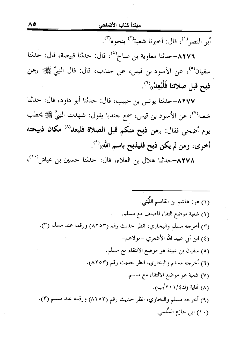 8276 - حدثنا معاوية بن صالح (¬1)، قال: حدثنا قبيصة، قال: حدثنا سفيان (¬2)، عن الأسود بن قيس، عن جندب، قال: قال النبيّ -صلى الله عليه وسلم-: "من ذبح قبل صلاتنا فَلْيُعِدْ" (¬3).