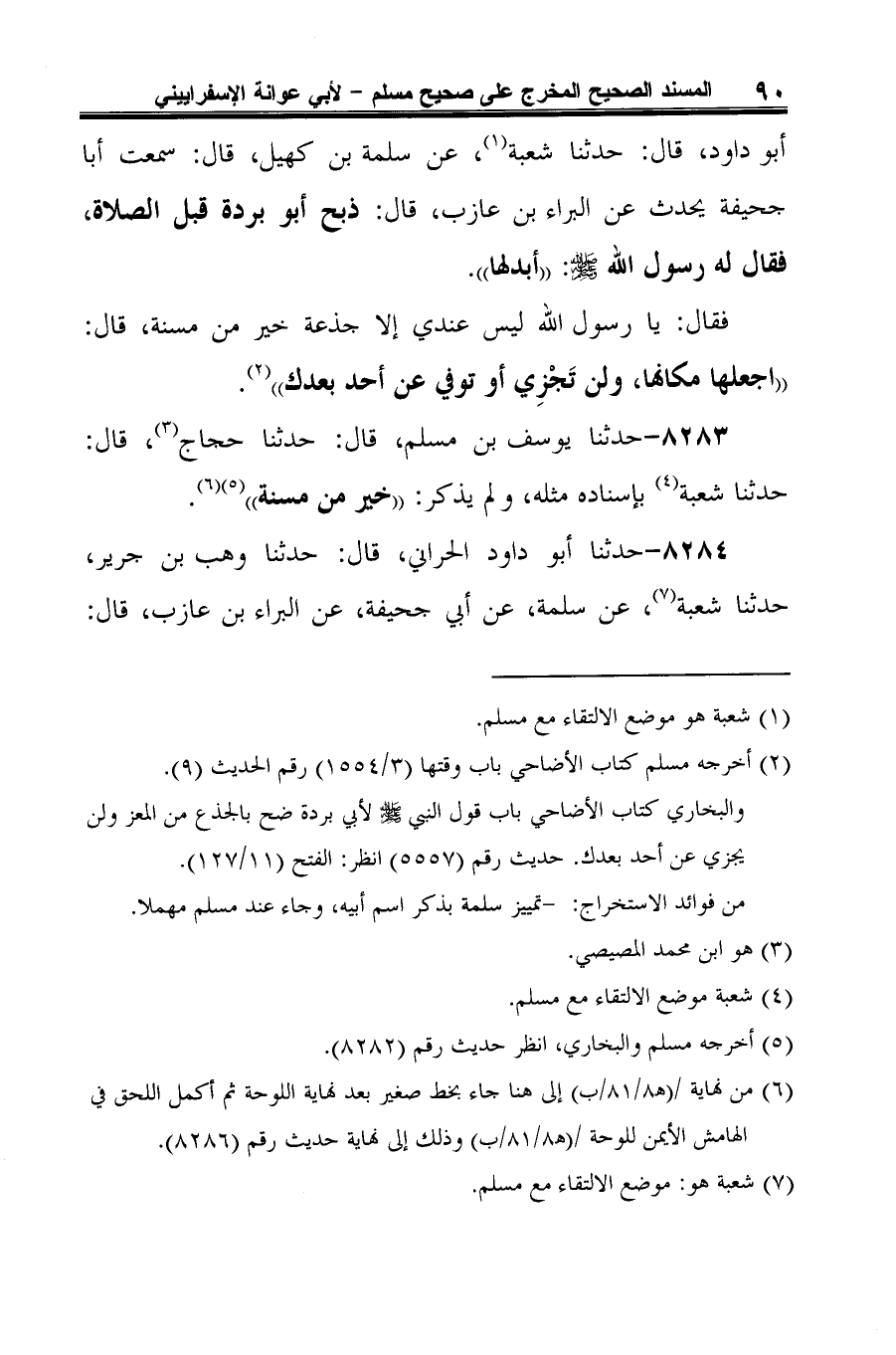 -[91]- ذبح أبو بردة بن نيار قبل الصلاة فأمر (¬2) رسول الله -صلى الله عليه وسلم- أن يعيد مكانها. قال: يا رسول الله عندي جذعة خر من مُسِنَّة، قال: "اذبحها، ولن تجزي أو تُوفَيَ عن أحد بعدك" (¬3).