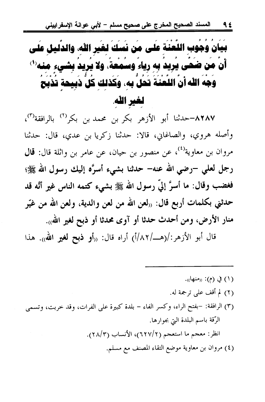 8287 - حدثنا أبو الأزهر بكر بن محمد بن بكر (¬1) بالرافقة (¬2)، وأصله هروي، والصاغاني، قالا: حدثنا زكريا بن عدي، قال: حدثنا مروان بن معاوية (¬3)، عن منصور بن حيان، عن عامر بن واثلة قال: قال رجل لعلي -رضي الله عنه- حدثنا بشيء أسرَّه إليك رسول الله -صلى الله عليه وسلم-، فغضب وقال: ما أسرَّ إليّ رسول الله -صلى الله عليه وسلم- بشيء كتمه الناس غير أنَّه قد حدثني بكلمات أربع قال: "لعن الله من لعن والدية، ولعن الله من غيّر منار الأرض، ومن أحدث حدثا أو آوى محدثا أو ذبح لغير الله".