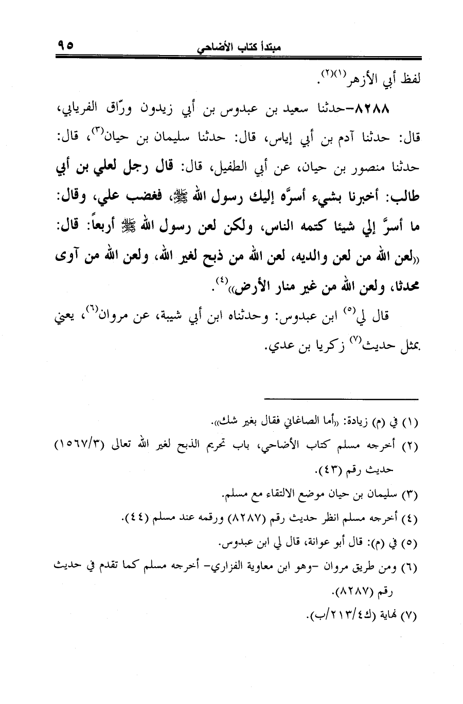 8288 - حدثنا سعيد بن عبدوس بن أبي زيدون ورّاق الفريابي، قال: حدثنا آدم بن أبي إياس، قال: حدثنا سليمان بن حيان (¬1)، قال: حدثنا منصور بن حيان، عن أبي الطفيل، قال: قال رجل لعلي بن أبي طالب: أخبرنا بشيء أسرَّه إليك رسول الله -صلى الله عليه وسلم-، فغضب علي، وقال: ما أسرَّ إلي شيئا كتمه الناس، ولكن لعن رسول الله -صلى الله عليه وسلم- أربعًا: قال: "لعن الله من لعن والديه، لعن الله من ذبح لغير الله، ولعن الله من آوى محدثا، ولعن الله من غير منار الأرض" (¬2).
