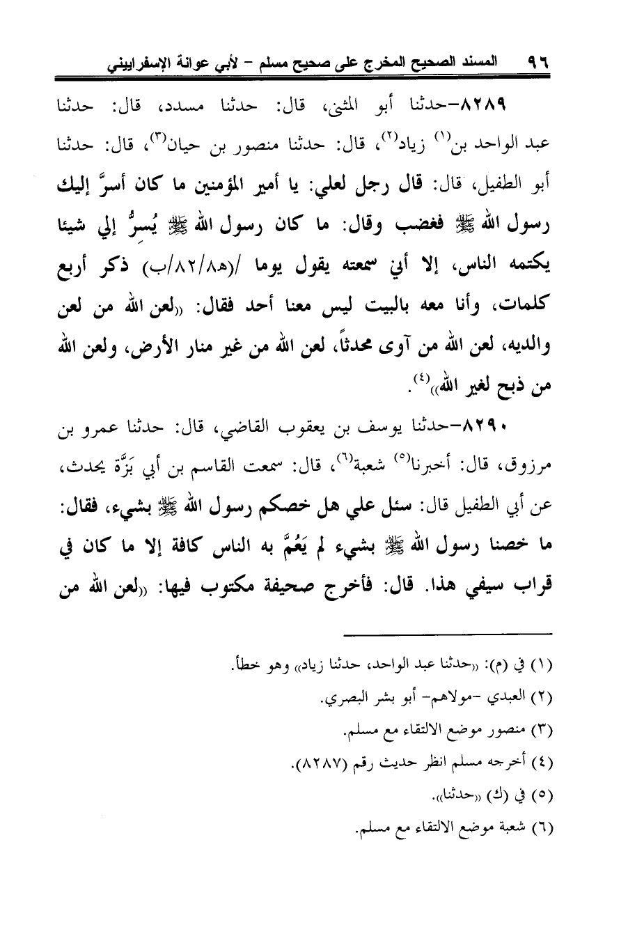 8289 - حدثنا أبو المثنى، قال: حدثنا مسدد، قال: حدثنا عبد الواحد بن (¬1) زياد (¬2)، قال: حدثنا منصور بن حيان (¬3)، قال: حدثنا أبو الطفيل، قال: قال رجل لعلي: يا أمير المؤمنين ما كان أسرَّ إليك رسول الله -صلى الله عليه وسلم- فغضب وقال: ما كان رسول الله -صلى الله عليه وسلم- يُسِرُّ إلي شيئا يكتمه الناس، إلا أني سمعته يقول يوما ذكر أربع كلمات، وأنا معه بالبيت ليس معنا أحد فقال: "لعن الله من لعن والديه، لعن الله من آوى محدثًا، لعن الله من غير منار الأرض، ولعن الله من ذبح لغير الله" (¬4).