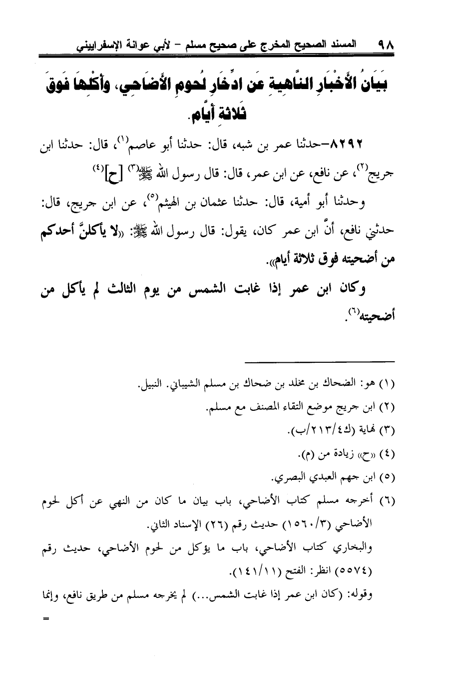 (¬6) أخرجه مسلم كتاب الأضاحي، باب بيان ما كان من النهي عن أكل لحوم الأضاحي (3/ 1560) حديث رقم (26) الإسناد الثاني.