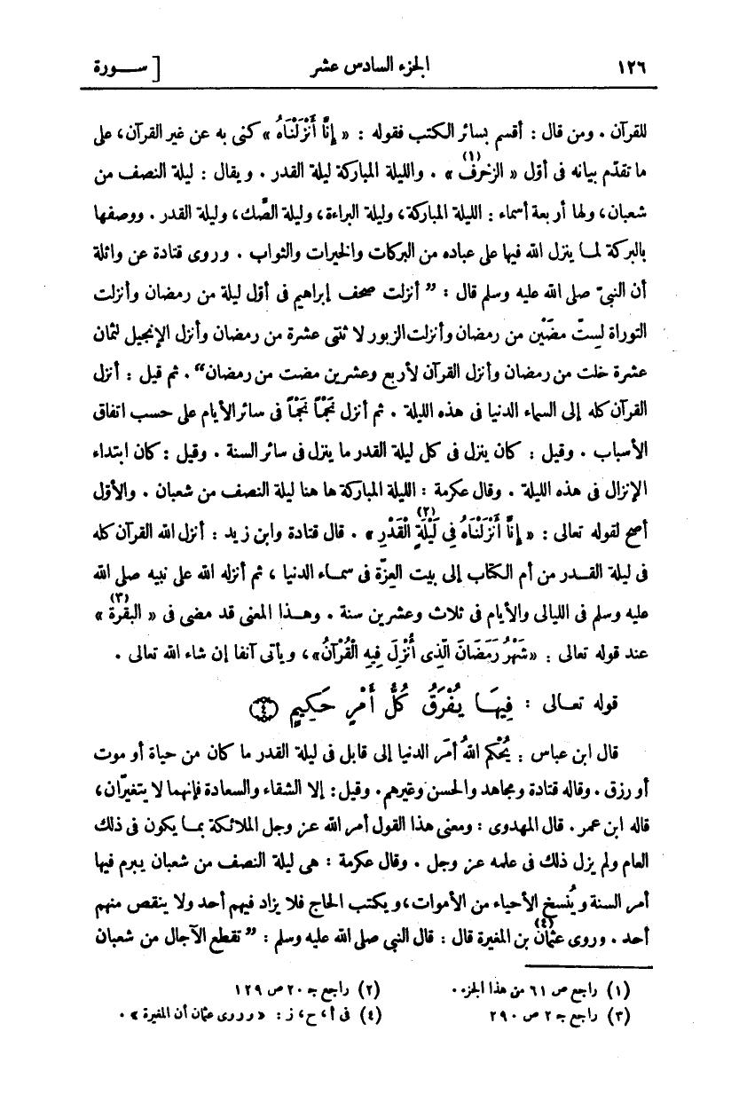 لِلْقُرْآنِ. وَمَنْ قَالَ: أَقْسَمَ بِسَائِرِ الْكُتُبِ فَقَوْلُهُ" إِنَّا أَنْزَلْناهُ" كَنَّى بِهِ عَنْ غَيْرِ الْقُرْآنِ، عَلَى مَا تَقَدَّمَ بَيَانُهُ فِي أَوَّلِ" الزُّخْرُفِ" «١» وَاللَّيْلَةُ الْمُبَارَكَةُ لَيْلَةُ الْقَدْرِ. وَيُقَالُ: لَيْلَةُ النِّصْفِ مِنْ شَعْبَانَ، وَلَهَا أَرْبَعَةُ أَسْمَاءٍ: اللَّيْلَةُ الْمُبَارَكَةُ، وَلَيْلَةُ الْبَرَاءَةِ، وَلَيْلَةُ الصَّكِّ، وَلَيْلَةُ الْقَدْرِ. وَوَصَفَهَا بِالْبَرَكَةِ لِمَا يُنْزِلُ اللَّهُ فِيهَا عَلَى عِبَادِهِ مِنَ الْبَرَكَاتِ وَالْخَيْرَاتِ وَالثَّوَابِ. وَرَوَى قَتَادَةُ عَنْ وَاثِلَةَ أَنَّ النَّبِيَّ صَلَّى اللَّهُ عَلَيْهِ وَسَلَّمَ قَالَ: (أُنْزِلَتْ صُحُفُ إِبْرَاهِيمَ فِي أَوَّلِ لَيْلَةٍ مِنْ رَمَضَانَ وَأُنْزِلَتِ التَّوْرَاةُ لِسِتٍّ مَضَيْنَ مِنْ رَمَضَانَ وَأُنْزِلَتِ الزَّبُورُ لِاثْنَتَيْ عَشْرَةَ مِنْ رَمَضَانَ وَأُنْزِلَ الْإِنْجِيلُ لِثَمَانِ عَشْرَةَ خَلَتْ مِنْ رَمَضَانَ وَأُنْزِلَ الْقُرْآنُ لِأَرْبَعٍ وَعِشْرِينَ مَضَتْ مِنْ رَمَضَانَ (. ثُمَّ قِيلَ: أُنْزِلَ الْقُرْآنُ كُلُّهُ إِلَى السَّمَاءِ الدُّنْيَا فِي هَذِهِ اللَّيْلَةِ. ثُمَّ أُنْزِلَ نَجْمًا نَجْمًا فِي سَائِرِ الْأَيَّامِ عَلَى حَسْبِ اتِّفَاقِ الْأَسْبَابِ. وَقِيلَ: كَانَ يَنْزِلُ فِي كُلِّ لَيْلَةِ الْقَدْرِ مَا يَنْزِلُ فِي سَائِرِ السَّنَةِ. وَقِيلَ كَانَ ابْتِدَاءُ الْإِنْزَالِ فِي هَذِهِ اللَّيْلَةِ. وَقَالَ عكرمة: الليلة المباركة ها هنا لَيْلَةُ النِّصْفِ مِنْ شَعْبَانَ. وَالْأَوَّلُ أَصَحُّ لِقَوْلِهِ تعالى:" إِنَّا أَنْزَلْناهُ فِي لَيْلَةِ الْقَدْرِ" «٢» [الْقَدْرِ: ١]. قَالَ قَتَادَةُ وَابْنُ زَيْدٍ: أَنْزَلَ اللَّهُ الْقُرْآنَ كُلَّهُ فِي لَيْلَةِ الْقَدْرِ مِنْ أُمِّ الْكِتَابِ إِلَى بَيْتِ الْعِزَّةِ فِي سَمَاءِ الدُّنْيَا، ثُمَّ أَنْزَلَهُ اللَّهُ عَلَى نَبِيِّهِ صَلَّى اللَّهُ عَلَيْهِ وَسَلَّمَ فِي اللَّيَالِي وَالْأَيَّامِ فِي ثَلَاثٍ وَعِشْرِينَ سَنَةً. وَهَذَا الْمَعْنَى قَدْ مَضَى فِي" الْبَقَرَةِ" «٣» عِنْدَ قَوْلِهِ تَعَالَى" شَهْرُ رَمَضانَ الَّذِي أُنْزِلَ فِيهِ الْقُرْآنُ" [البقرة: ١٨٥]، ويأتي آنفا إن شاء الله تعالى.