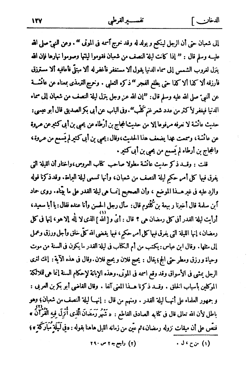 إِلَى شَعْبَانَ حَتَّى إِنَّ الرَّجُلَ لَيَنْكِحُ وَيُولَدُ لَهُ وَقَدْ خَرَجَ اسْمُهُ فِي الْمَوْتَى (. وَعَنِ النَّبِيِّ صَلَّى اللَّهُ عَلَيْهِ وَسَلَّمَ قَالَ:) إِذَا كَانَتْ لَيْلَةُ النِّصْفِ مِنْ شَعْبَانَ فَقُومُوا لَيْلَتَهَا وَصُومُوا نَهَارَهَا فَإِنَّ اللَّهَ يَنْزِلُ لِغُرُوبِ الشَّمْسِ إِلَى سَمَاءِ الدُّنْيَا يَقُولُ أَلَا مُسْتَغْفِرٌ فَأَغْفِرَ لَهُ أَلَا مُبْتَلًى فَأُعَافِيَهُ أَلَا مُسْتَرْزِقٌ فَأَرْزُقَهُ أَلَا كَذَا أَلَا كَذَا حَتَّى يَطْلُعَ الْفَجْرُ) ذَكَرَهُ الثَّعْلَبِيُّ. وَخَرَّجَ التِّرْمِذِيُّ بِمَعْنَاهُ عَنْ عَائِشَةُ عَنِ النَّبِيِّ صَلَّى اللَّهُ عَلَيْهِ وَسَلَّمَ قَالَ: (إِنَّ اللَّهَ عَزَّ وَجَلَّ يَنْزِلُ لَيْلَةَ النِّصْفِ مِنْ شَعْبَانَ إِلَى سَمَاءِ الدُّنْيَا فَيَغْفِرُ لِأَكْثَرِ مِنْ عَدَدِ شَعْرِ غَنَمِ كَلْبٍ (. وَفِي الْبَابِ عَنْ أَبِي بَكْرٍ الصِّدِّيقِ قَالَ أَبُو عِيسَى: حَدِيثُ عَائِشَةَ لَا نَعْرِفُهُ مَرْفُوعًا إِلَّا مِنْ حَدِيثِ الْحَجَّاجِ بْنِ أَرْطَاةَ عَنْ يَحْيَى بْنِ أبي كثيرة عَنْ عُرْوَةَ عَنْ عَائِشَةَ، وَسَمِعْتُ مُحَمَّدًا يُضَعِّفُ هَذَا الْحَدِيثَ، وَقَالَ: يَحْيَى بْنُ أَبِي كَثِيرٍ لَمْ يَسْمَعْ مِنْ عُرْوَةَ وَالْحَجَّاجُ بْنُ أَرْطَأةَ لَمْ يَسْمَعْ مِنْ يَحْيَى بْنِ أَبِي كَثِيرٍ. قُلْتُ: وَقَدْ ذَكَرَ حَدِيثَ عَائِشَةَ مُطَوَّلًا صَاحِبُ كِتَابِ الْعَرُوسِ، وَاخْتَارَ أَنَّ اللَّيْلَةَ الَّتِي يُفْرَقُ فِيهَا كُلُّ أَمْرٍ حَكِيمٍ لَيْلَةَ النِّصْفِ مِنْ شَعْبَانَ، وَأَنَّهَا تُسَمَّى لَيْلَةَ الْبَرَاءَةِ. وَقَدْ ذَكَرْنَا قَوْلَهُ وَالرَّدَّ عَلَيْهِ فِي غَيْرِ هَذَا الْمَوْضِعِ، وَأَنَّ الصَّحِيحَ إِنَّمَا هِيَ لَيْلَةُ الْقَدْرِ عَلَى ما بيناه. روى حماد ابن سَلَمَةَ قَالَ أَخْبَرَنَا رَبِيعَةُ بْنُ كُلْثُومٍ قَالَ: سَأَلَ رَجُلٌ الْحَسَنَ وَأَنَا عِنْدَهُ فَقَالَ: يَا أَبَا سَعِيدٍ، أَرَأَيْتَ لَيْلَةَ الْقَدْرِ أَفِي كُلِّ رَمَضَانَ هِيَ؟ قَالَ: إِي وَاللَّهِ»