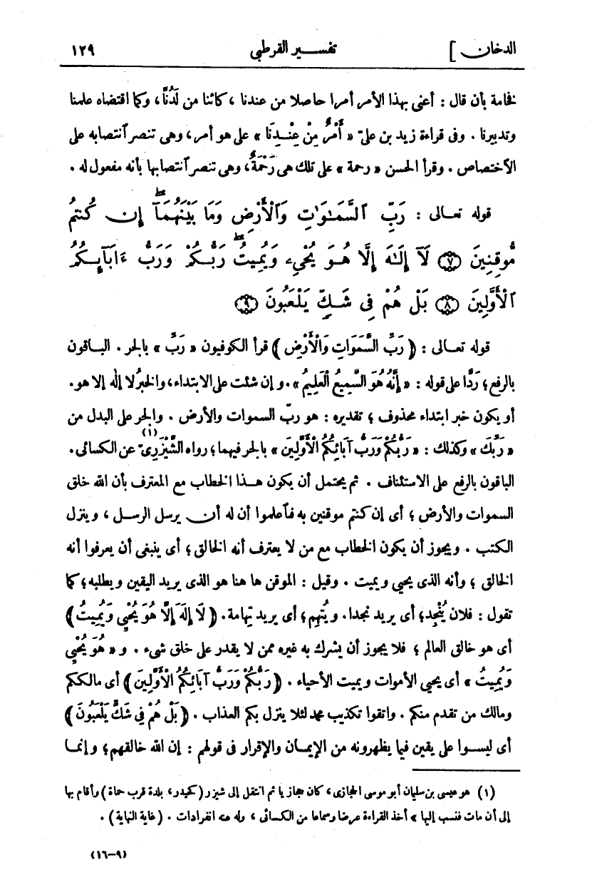 قَوْلُهُ تَعَالَى:" رَبِّ السَّماواتِ وَالْأَرْضِ" قَرَأَ الْكُوفِيُّونَ" رَبِّ" بِالْجَرِّ. الْبَاقُونَ بِالرَّفْعِ، رَدًّا عَلَى قَوْلِهِ" إِنَّهُ هُوَ السَّمِيعُ الْعَلِيمُ". وَإِنْ شِئْتَ عَلَى الِابْتِدَاءِ، وَالْخَبَرُ لَا إِلَهَ إِلَّا هُوَ. أو يكون خبر ابتداء محذوف، تقديره: هو رب السموات وَالْأَرْضِ. وَالْجَرُّ عَلَى الْبَدَلِ مِنْ" رَبِّكَ" وَكَذَلِكَ" رَبُّكُمْ وَرَبُّ آبائِكُمُ الْأَوَّلِينَ" بِالْجَرِّ فِيهِمَا، رَوَاهُ الشَّيْزَرِيُّ «١» عَنِ الْكِسَائِيِّ. الْبَاقُونَ بِالرَّفْعِ عَلَى الِاسْتِئْنَافِ. ثُمَّ يَحْتَمِلُ أَنْ يَكُونَ هَذَا الْخِطَابُ مَعَ المعترف بأن الله خلق السموات وَالْأَرْضَ، أَيْ إِنْ كُنْتُمْ مُوقِنِينَ بِهِ فَاعْلَمُوا أَنَّ لَهُ أَنْ يُرْسِلَ الرُّسُلَ، وَيُنْزِلَ الْكُتُبَ. وَيَجُوزُ أَنْ يَكُونَ الْخِطَابُ مَعَ مَنْ لَا يَعْتَرِفُ أَنَّهُ الْخَالِقُ، أَيْ يَنْبَغِي أَنْ يَعْرِفُوا أَنَّهُ الْخَالِقُ، وَأَنَّهُ الَّذِي يُحْيِي وَيُمِيتُ. وَقِيلَ: الموقن ها هنا هُوَ الَّذِي يُرِيدُ الْيَقِينَ وَيَطْلُبُهُ، كَمَا تَقُولُ: فُلَانٌ يُنْجِدُ، أَيْ يُرِيدُ نَجْدًا. وَيُتْهِمُ، أَيْ يُرِيدُ تِهَامَةَ." لَا إِلهَ إِلَّا هُوَ يُحْيِي وَيُمِيتُ" أَيْ هُوَ خَالِقُ الْعَالَمِ، فَلَا يَجُوزُ أَنْ يُشْرِكَ بِهِ غَيْرُهُ مِمَّنْ لَا يَقْدِرُ على خلق شي. و" هُوَ يُحْيِي وَيُمِيتُ" أَيْ يُحْيِي الْأَمْوَاتَ وَيُمِيتُ الْأَحْيَاءَ." رَبُّكُمْ وَرَبُّ آبائِكُمُ الْأَوَّلِينَ" أَيْ مَالِكُكُمْ وَمَالِكُ مَنْ تَقَدَّمَ مِنْكُمْ. وَاتَّقُوا تَكْذِيبَ مُحَمَّدٍ لِئَلَّا يَنْزِلَ بِكُمُ الْعَذَابُ." بَلْ هُمْ فِي شَكٍّ يَلْعَبُونَ" أَيْ لَيْسُوا عَلَى يَقِينٍ فِيمَا يُظْهِرُونَهُ مِنَ الْإِيمَانِ وَالْإِقْرَارِ فِي قَوْلِهِمْ: إِنَّ اللَّهَ خالقهم، وإنما
