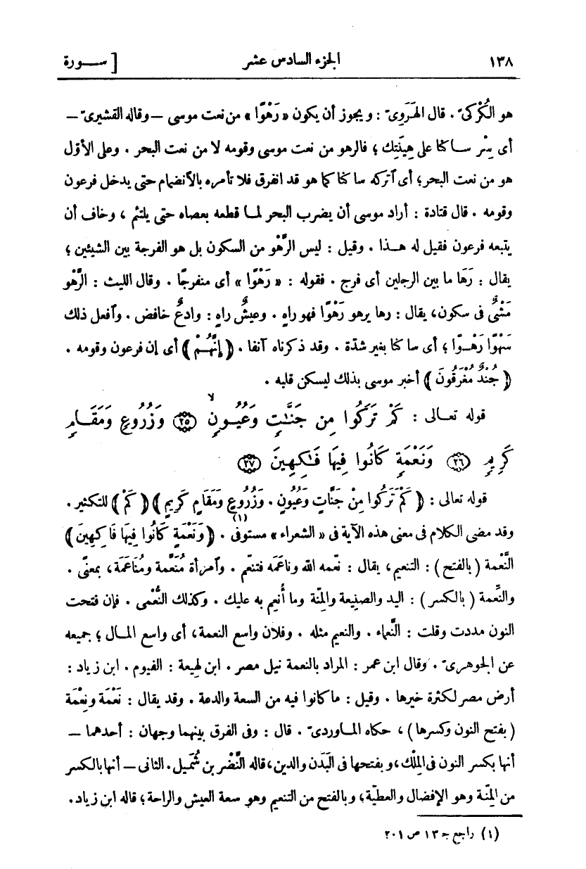 قَوْلُهُ تَعَالَى:" كَمْ تَرَكُوا مِنْ جَنَّاتٍ وَعُيُونٍ. وَزُرُوعٍ وَمَقامٍ كَرِيمٍ"" كم" للتكثير. وَقَدْ مَضَى الْكَلَامُ فِي مَعْنَى هَذِهِ الْآيَةِ فِي" الشُّعَرَاءِ" مُسْتَوْفًى «١»." وَنَعْمَةٍ كانُوا فِيها فاكِهِينَ" النَّعْمَةُ (بِالْفَتْحِ) التَّنْعِيمُ، يُقَالُ: نَعَّمَهُ اللَّهُ وَنَاعَمَهُ فَتَنَعَّمَ. وَامْرَأَةٌ مُنَعَّمَةٌ وَمُنَاعَمَةٌ، بِمَعْنًى. وَالنِّعْمَةُ (بِالْكَسْرِ) الْيَدُ وَالصَّنِيعَةُ وَالْمِنَّةُ وَمَا أَنْعَمَ بِهِ عَلَيْكَ. وَكَذَلِكَ النُّعْمَى. فَإِنْ فَتَحْتَ النُّونَ مَدَدْتَ وَقُلْتَ: النَّعْمَاءُ. وَالنَّعِيمُ مِثْلُهُ. وَفُلَانٌ وَاسِعُ النَّعْمَةِ، أَيْ وَاسِعُ الْمَالِ، جَمِيعُهُ عَنِ الْجَوْهَرِيِّ. وَقَالَ ابْنُ عُمَرَ: الْمُرَادُ بِالنَّعْمَةِ نِيلُ مِصْرَ. ابْنُ لَهِيعَةَ: الْفَيُّومُ. ابْنُ زِيَادٍ: أَرْضُ مِصْرَ لِكَثْرَةِ خَيْرِهَا. وَقِيلَ: مَا كَانُوا فِيهِ مِنَ السَّعَةِ وَالدَّعَةِ. وَقَدْ يُقَالُ: نِعْمَةٌ وَنَعْمَةٌ (بِفَتْحِ النُّونِ وَكَسْرِهَا)، حَكَاهُ الْمَاوَرْدِيُّ. قَالَ: وَفِي الْفَرْقِ بَيْنَهُمَا وَجْهَانِ: أَحَدُهُمَا- أَنَّهَا بِكَسْرِ النُّونِ فِي الْمُلْكِ، وَبِفَتْحِهَا فِي الْبَدَنِ وَالدِّينِ، قَالَهُ النَّضْرُ بْنُ شُمَيْلٍ. الثَّانِي- أَنَّهَا بِالْكَسْرِ مِنَ الْمِنَّةِ وَهُوَ الْإِفْضَالُ وَالْعَطِيَّةُ، وَبِالْفَتْحِ مِنَ التَّنْعِيمِ وَهُوَ سَعَةُ الْعَيْشِ والراحة، قاله ابن زياد.