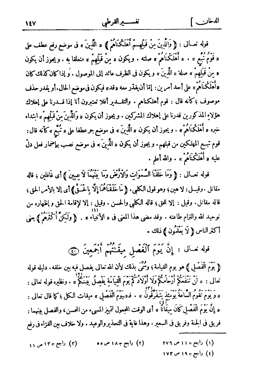 قَوْلُهُ تَعَالَى:" وَالَّذِينَ مِنْ قَبْلِهِمْ أَهْلَكْناهُمْ"" الَّذِينَ" فِي مَوْضِعِ رَفْعِ عَطْفٍ عَلَى" قَوْمُ تُبَّعٍ"." أَهْلَكْناهُمْ" صِلَتُهُ. وَيَكُونُ" مِنْ قَبْلِهِمْ" مُتَعَلِّقًا بِهِ. وَيَجُوزُ أَنْ يَكُونَ" مِنْ قَبْلِهِمْ" صِلَةَ" الَّذِينَ" وَيَكُونُ فِي الظَّرْفِ عَائِدٌ إِلَى الْمَوْصُولِ. وَإِذَا كَانَ كَذَلِكَ كَانَ" أَهْلَكْناهُمْ" عَلَى أَحَدِ أَمْرَيْنِ: إِمَّا أَنْ يُقَدَّرَ مَعَهُ" قَدْ" فَيَكُونُ فِي مَوْضِعِ الْحَالِ. أَوْ يُقَدَّرُ حَذْفٌ مَوْصُوفٌ، كَأَنَّهُ قَالَ: قَوْمٌ أَهْلَكْنَاهُمْ. وَالتَّقْدِيرُ أَفَلَا تَعْتَبِرُونَ أَنَّا إِذَا قَدَرْنَا عَلَى إِهْلَاكِ هَؤُلَاءِ الْمَذْكُورِينَ قَدَرْنَا عَلَى إِهْلَاكِ الْمُشْرِكِينَ. وَيَجُوزُ أَنْ يَكُونَ" وَالَّذِينَ مِنْ قَبْلِهِمْ" ابْتِدَاءٌ خَبَرُهُ" أَهْلَكْناهُمْ". وَيَجُوزُ أَنْ يَكُونَ" الَّذِينَ" فِي مَوْضِعِ جَرٍّ عَطْفًا عَلَى" تُبَّعٍ" كَأَنَّهُ قَالَ: قَوْمُ تُبَّعٍ الْمُهْلِكِينَ مِنْ قَبْلِهِمْ. وَيَجُوزُ أَنْ يَكُونَ" الَّذِينَ" فِي مَوْضِعِ نَصْبٍ بِإِضْمَارِ فِعْلٍ دَلَّ عَلَيْهِ" أَهْلَكْناهُمْ". وَاللَّهُ أَعْلَمُ. قَوْلُهُ تَعَالَى:" وَما خَلَقْنَا السَّماواتِ وَالْأَرْضَ وَما بَيْنَهُما لاعِبِينَ" أَيْ غَافِلِينَ، قَالَهُ مُقَاتِلٌ. وقيل: لاهين، وهو قول الكلبي." وما خَلَقْناهُما إِلَّا بِالْحَقِّ" أَيْ إِلَّا بِالْأَمْرِ الْحَقِّ، قَالَهُ مُقَاتِلٌ. وَقِيلَ: إِلَّا لِلْحَقِّ، قَالَهُ الْكَلْبِيُّ والحسن. وقيل: إلا لإقامة الحق وإظهاره مِنْ تَوْحِيدِ اللَّهِ وَالْتِزَامِ طَاعَتِهِ. وَقَدْ مَضَى هَذَا الْمَعْنَى فِي" الْأَنْبِيَاءِ" «١»." وَلكِنَّ أَكْثَرَهُمْ" يَعْنِي أكثر الناس." لا يَعْلَمُونَ" ذلك.