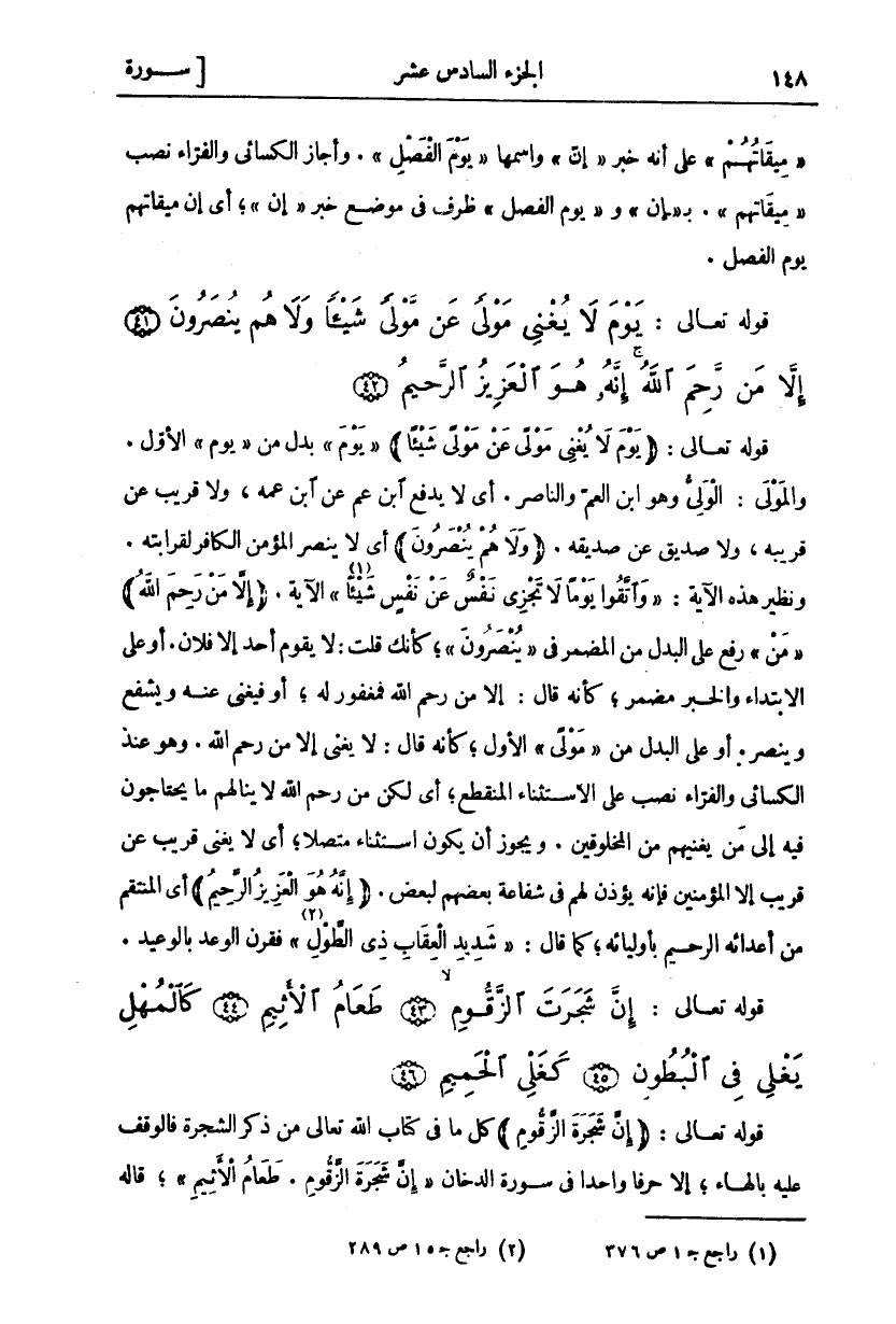 قَوْلُهُ تَعَالَى:" يَوْمَ لَا يُغْنِي مَوْلًى عَنْ مَوْلًى شَيْئاً"" يَوْمَ" بَدَلٌ مِنْ" يَوْمَ" الْأَوَّلِ. وَالْمَوْلَى: الْوَلِيُّ وَهُوَ ابْنُ الْعَمِّ وَالنَّاصِرُ. أَيْ لَا يَدْفَعُ ابْنُ عَمٍّ عَنِ ابْنِ عَمِّهِ، وَلَا قَرِيبٌ عَنْ قَرِيبِهِ، وَلَا صَدِيقٌ عَنْ صَدِيقِهِ." وَلا هُمْ يُنْصَرُونَ" أَيْ لَا يَنْصُرُ الْمُؤْمِنُ الْكَافِرَ لِقَرَابَتِهِ. وَنَظِيرُ هَذِهِ الْآيَةِ" وَاتَّقُوا يَوْماً لَا تَجْزِي نَفْسٌ عَنْ نَفْسٍ شَيْئاً" «١» [البقرة: ٤٨] الْآيَةَ." إِلَّا مَنْ رَحِمَ اللَّهُ"" مَنْ" رُفِعَ عَلَى الْبَدَلِ مِنَ الْمُضْمَرِ فِي" يُنْصَرُونَ"، كَأَنَّكَ قُلْتَ: لَا يَقُومُ أَحَدٌ إِلَّا فُلَانٌ. أَوْ عَلَى الِابْتِدَاءِ وَالْخَبَرُ مُضْمَرٌ، كَأَنَّهُ قَالَ: إِلَّا مَنْ رَحِمَ اللَّهُ فَمَغْفُورٌ لَهُ، أَوْ فَيُغْنِي عَنْهُ وَيَشْفَعُ وَيَنْصُرُ. أَوْ عَلَى الْبَدَلِ مِنْ" مَوْلًى" الْأَوَّلِ، كَأَنَّهُ قَالَ: لَا يُغْنِي إِلَّا مَنْ رَحِمَ اللَّهُ. وَهُوَ عِنْدَ الْكِسَائِيِّ وَالْفَرَّاءِ نَصْبٍ عَلَى الِاسْتِثْنَاءِ الْمُنْقَطِعِ، أَيْ لَكِنْ مَنْ رَحِمَ اللَّهُ لَا يَنَالُهُمْ مَا يَحْتَاجُونَ فِيهِ إِلَى مَنْ يُغْنِيهِمْ مِنَ الْمَخْلُوقِينَ. وَيَجُوزُ أَنْ يَكُونَ اسْتِثْنَاءً مُتَّصِلًا، أَيْ لَا يُغْنِي قَرِيبٌ عَنْ قَرِيبٍ إِلَّا الْمُؤْمِنِينَ فَإِنَّهُ يُؤْذَنُ لَهُمْ فِي شَفَاعَةِ بَعْضِهِمْ لِبَعْضٍ." إِنَّهُ هُوَ الْعَزِيزُ الرَّحِيمُ" أَيِ الْمُنْتَقِمُ مِنْ أَعْدَائِهِ الرَّحِيمُ بِأَوْلِيَائِهِ، كما قال" شَدِيدِ الْعِقابِ ذِي الطَّوْلِ" «٢» [غافر: ٣] فقرن الوعد بالوعيد.