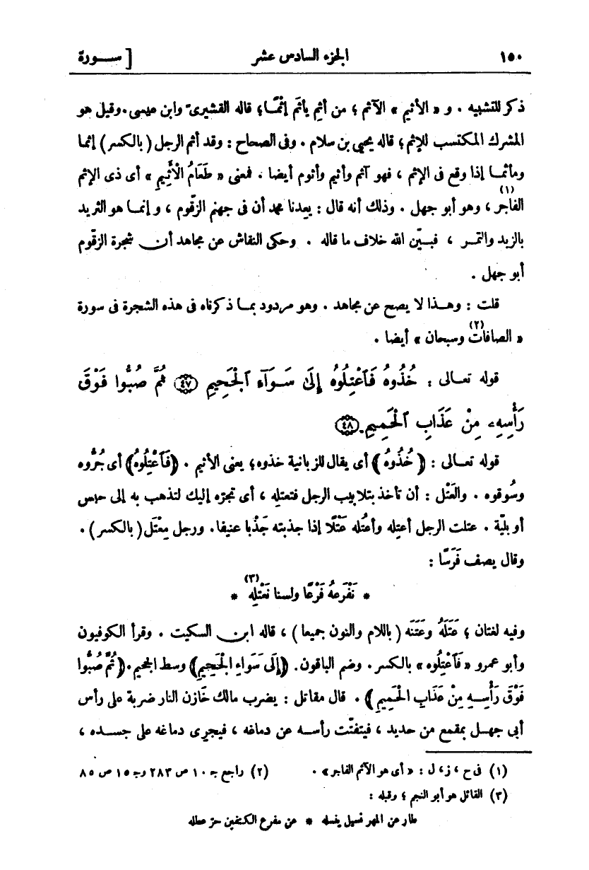 وَفِيهِ لُغَتَانِ: عَتَلَهُ وَعَتَنَهُ (بِاللَّامِ وَالنُّونِ جَمِيعًا)، قَالَهُ ابْنُ السِّكِّيتِ. وَقَرَأَ الْكُوفِيُّونَ وَأَبُو عَمْرٍو" فَاعْتِلُوهُ" بِالْكَسْرِ. وَضَمَّ الْبَاقُونَ." إِلى سَواءِ الْجَحِيمِ" وَسَطَ الْجَحِيمِ." ثُمَّ صُبُّوا فَوْقَ رَأْسِهِ مِنْ عَذابِ الْحَمِيمِ" قَالَ مُقَاتِلٌ: يَضْرِبُ مَالِكٌ خَازِنُ النَّارِ ضَرْبَةً عَلَى رَأْسِ أَبِي جَهْلٍ بِمَقْمَعٍ مِنْ حَدِيدٍ، فَيَتَفَتَّتُ رَأْسُهُ عن دماغه، فيجري دماغه عل جسده،