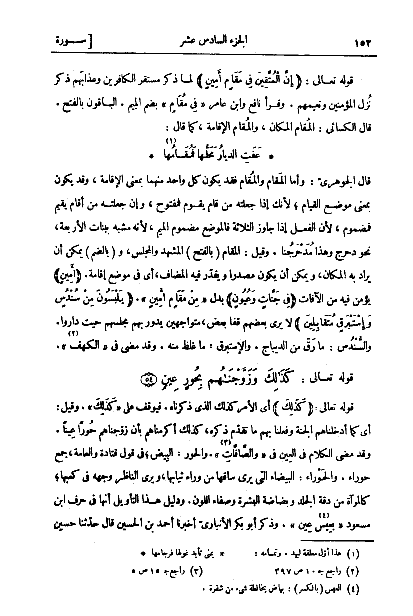 قَوْلُهُ تَعَالَى:" كَذلِكَ" أَيِ الْأَمْرُ كَذَلِكَ الَّذِي ذَكَرْنَاهُ. فَيُوقَفُ عَلَى" كَذلِكَ". وَقِيلَ: أَيْ كَمَا أَدْخَلْنَاهُمُ الْجَنَّةَ وَفَعَلْنَا بِهِمْ مَا تَقَدَّمَ ذِكْرُهُ، كَذَلِكَ أَكْرَمْنَاهُمْ بِأَنْ زَوَّجْنَاهُمْ حُورًا عِينًا. وَقَدْ مَضَى الْكَلَامُ فِي الْعِينِ فِي" وَالصَّافَّاتِ" «٣». وَالْحُورُ: الْبِيضُ، فِي قَوْلِ قَتَادَةَ وَالْعَامَّةِ، جَمْعُ حَوْرَاءَ. وَالْحَوْرَاءُ: الْبَيْضَاءُ الَّتِي يُرَى سَاقُهَا مِنْ وَرَاءِ ثِيَابِهَا، وَيَرَى النَّاظِرُ وَجْهَهُ فِي كَعْبِهَا، كَالْمِرْآةِ مِنْ دِقَّةِ الْجِلْدِ وَبَضَاضَةِ الْبَشَرَةِ وَصَفَاءِ اللَّوْنِ. وَدَلِيلُ هَذَا التَّأْوِيلِ أَنَّهَا فِي حَرْفِ ابْنِ مَسْعُودٍ" بِعِيسٍ «٤» عِينٍ". وَذَكَرَ أَبُو بَكْرٍ الْأَنْبَارِيُّ أَخْبَرَنَا أَحْمَدُ بْنُ الحسين قال حدثنا حسين