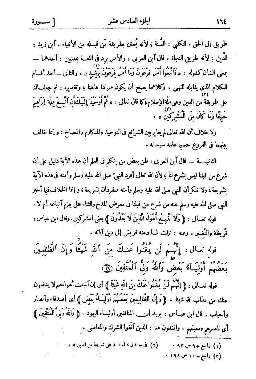 طَرِيقٌ إِلَى الْحَقِّ. الْكَلْبِيُّ: السُّنَّةُ، لِأَنَّهُ يَسْتَنُّ بِطَرِيقَةِ مَنْ قَبْلَهُ مِنَ الْأَنْبِيَاءِ. ابْنُ زَيْدٍ: الدِّينُ، لِأَنَّهُ طَرِيقُ النَّجَاةِ. قَالَ ابْنُ الْعَرَبِيِّ: وَالْأَمْرُ يَرِدُ فِي اللُّغَةِ بِمَعْنَيَيْنِ: أَحَدُهُمَا- بِمَعْنَى الشَّأْنِ كَقَوْلِهِ:" فَاتَّبَعُوا أَمْرَ فِرْعَوْنَ وَما أَمْرُ فِرْعَوْنَ بِرَشِيدٍ" «١» [هود: ٩٧]. وَالثَّانِي- أَحَدُ أَقْسَامِ الْكَلَامِ الَّذِي يُقَابِلُهُ النَّهْيُ. وكلاهما يصح أن يكون مرادا ها هنا، وَتَقْدِيرُهُ: ثُمَّ جَعَلْنَاكَ عَلَى طَرِيقَةٍ «٢» مِنَ الدِّينِ وَهِيَ مِلَّةُ الْإِسْلَامِ، كَمَا قَالَ تَعَالَى:" ثُمَّ أَوْحَيْنا إِلَيْكَ أَنِ اتَّبِعْ مِلَّةَ إِبْراهِيمَ حَنِيفاً وَما كانَ مِنَ الْمُشْرِكِينَ" «٣» [النحل: ١٢٣]. وَلَا خِلَافَ أَنَّ اللَّهَ تَعَالَى لَمْ يُغَايِرْ بَيْنَ الشَّرَائِعِ فِي التَّوْحِيدِ وَالْمَكَارِمِ وَالْمَصَالِحِ، وَإِنَّمَا خَالَفَ بَيْنَهُمَا فِي الْفُرُوعِ حَسْبَمَا عَلَّمَهُ سُبْحَانَهُ. الثانية- قَالَ ابْنُ الْعَرَبِيِّ: ظَنَّ بَعْضُ مَنْ يَتَكَلَّمُ فِي الْعِلْمِ أَنَّ هَذِهِ الْآيَةَ دَلِيلٌ عَلَى أَنَّ شَرْعَ مَنْ قَبْلَنَا لَيْسَ بِشَرْعٍ لَنَا، لِأَنَّ اللَّهَ تَعَالَى أَفْرَدَ النَّبِيَّ صَلَّى اللَّهُ عَلَيْهِ وَسَلَّمَ وَأُمَّتَهُ فِي هَذِهِ الْآيَةِ بِشَرِيعَةٍ، وَلَا نُنْكِرُ أَنَّ النَّبِيَّ صَلَّى اللَّهُ عَلَيْهِ وَسَلَّمَ وَأُمَّتَهُ مُنْفَرِدَانِ بِشَرِيعَةٍ، وَإِنَّمَا الْخِلَافُ فِيمَا أَخْبَرَ النَّبِيُّ صَلَّى اللَّهُ عَلَيْهِ وَسَلَّمَ عَنْهُ مِنْ شَرْعِ مَنْ قَبْلَنَا فِي مَعْرِضِ الْمَدْحِ وَالثَّنَاءِ هَلْ يَلْزَمُ اتِّبَاعُهُ أَمْ لَا. قَوْلُهُ تَعَالَى:" وَلا تَتَّبِعْ أَهْواءَ الَّذِينَ لَا يَعْلَمُونَ" يَعْنِي الْمُشْرِكِينَ. وَقَالَ ابْنُ عَبَّاسٍ: قُرَيْظَةُ وَالنَّضِيرُ. وَعَنْهُ: نَزَلَتْ لَمَّا دَعَتْهُ قُرَيْشٌ إِلَى دِينِ آبائه.