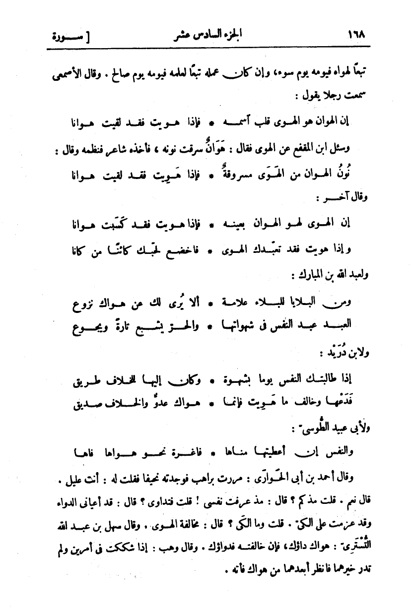 وَقَالَ أَحْمَدُ بْنُ أَبِي الْحَوَارِيِّ: مَرَرْتُ بِرَاهِبٍ فَوَجَدْتُهُ نَحِيفًا فَقُلْتُ لَهُ: أَنْتَ عَلِيلٌ. قَالَ نَعَمْ. قُلْتُ مُذْ كَمْ؟ قَالَ: مُذْ عَرَفْتُ نَفْسِي! قُلْتُ فَتَدَاوِي؟ قَالَ: قَدْ أَعْيَانِي الدَّوَاءُ، وَقَدْ عَزَمْتُ عَلَى الْكَيِّ. قُلْتُ وَمَا الْكَيُّ؟ قَالَ: مُخَالَفَةُ الْهَوَى. وَقَالَ سَهْلُ بْنُ عَبْدِ اللَّهِ التُّسْتَرِيُّ: هَوَاكَ دَاؤُكَ، فَإِنْ خَالَفْتَهُ فَدَوَاؤُكَ. وَقَالَ وَهْبٌ: إِذَا شَكَكْتَ فِي أَمْرَيْنِ وَلَمْ تَدْرِ خَيْرَهُمَا فَانْظُرْ أَبْعَدَهُمَا مِنْ هَوَاكَ فَأْتِهِ.