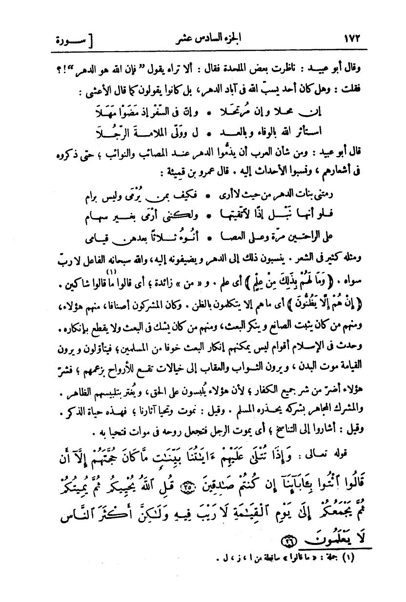 وقال أبو عبيد: ناظرت بعض الملحدة فَقَالَ: أَلَا تَرَاهُ يَقُولُ:" فَإِنَّ اللَّهَ هُوَ الدَّهْرُ"!؟ فَقُلْتُ: وَهَلْ كَانَ أَحَدٌ يَسُبُّ اللَّهَ فِي آبَادِ الدَّهْرِ، بَلْ كَانُوا يَقُولُونَ كَمَا قَالَ الْأَعْشَى: