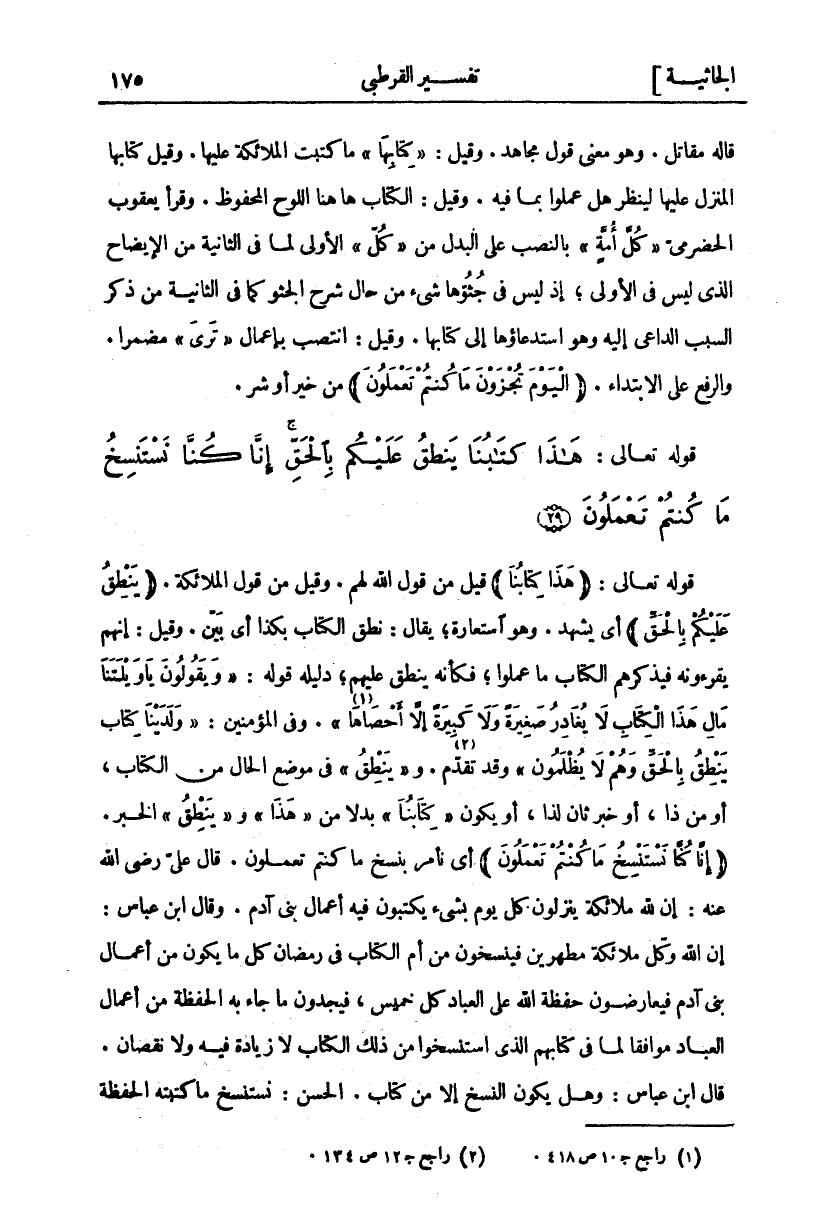 قَوْلُهُ تَعَالَى:" هَذَا كِتابُنا" قِيلَ مِنْ قَوْلِ اللَّهِ لَهُمْ. وَقِيلَ مِنْ قَوْلِ الْمَلَائِكَةِ." يَنْطِقُ عَلَيْكُمْ بِالْحَقِّ" أَيْ يَشْهَدُ. وَهُوَ اسْتِعَارَةٌ، يُقَالُ: نَطَقَ الْكِتَابُ بِكَذَا أَيْ بَيَّنَ. وَقِيلَ: إِنَّهُمْ يَقْرَءُونَهُ فَيُذَكِّرُهُمُ الْكِتَابُ مَا عَمِلُوا، فَكَأَنَّهُ يَنْطِقُ عَلَيْهِمْ، دَلِيلُهُ قَوْلُهُ:" وَيَقُولُونَ يَا وَيْلَتَنا مالِ هذَا الْكِتابِ لَا يُغادِرُ صَغِيرَةً وَلا كَبِيرَةً إِلَّا أَحْصاها" «١» [الكهف: ٤٩]. وَفِي الْمُؤْمِنِينَ:" وَلَدَيْنا كِتابٌ يَنْطِقُ بِالْحَقِّ وَهُمْ لَا يُظْلَمُونَ" «٢» وَقَدْ تَقَدَّمَ «٣». وَ" يَنْطِقُ" فِي، مَوْضِعِ الْحَالِ مِنَ الْكِتَابِ، أَوْ مِنْ ذَا، أَوْ خَبَرٌ ثَانٍ لِذَا، أَوْ يَكُونُ" كِتابُنا" بدلا من" هذا" و" يَنْطِقُ" الْخَبَرُ." إِنَّا كُنَّا نَسْتَنْسِخُ مَا كُنْتُمْ تَعْمَلُونَ" أَيْ نَأْمُرُ بِنَسْخِ مَا كُنْتُمْ تَعْمَلُونَ. قَالَ عَلِيٌّ رَضِيَ اللَّهُ عَنْهُ: إِنَّ لِلَّهِ مَلَائِكَةً يَنْزِلُونَ كُلَّ يَوْمٍ بِشَيْءٍ يَكْتُبُونَ فِيهِ أَعْمَالَ بَنِي آدَمَ. وَقَالَ ابْنُ عَبَّاسٍ: إِنَّ اللَّهَ وَكَّلَ مَلَائِكَةً مُطَهَّرِينَ فَيَنْسَخُونَ مِنْ أُمِّ الْكِتَابِ فِي رَمَضَانَ كُلَّ مَا يَكُونُ مِنْ أَعْمَالِ بَنِي آدَمَ فَيُعَارِضُونَ حَفَظَةَ اللَّهِ عَلَى الْعِبَادِ كُلَّ خَمِيسٍ، فَيَجِدُونَ مَا جَاءَ بِهِ الْحَفَظَةُ مِنْ أَعْمَالِ الْعِبَادِ مُوَافِقًا لِمَا فِي كِتَابِهِمُ الَّذِي اسْتَنْسِخُوا مِنْ ذَلِكَ الْكِتَابِ لَا زِيَادَةَ فِيهِ وَلَا نُقْصَانَ. قَالَ ابْنُ عَبَّاسٍ: وَهَلْ يَكُونُ النَّسْخُ إِلَّا مِنْ كِتَابٍ. الْحَسَنُ: نَسْتَنْسِخُ ما كتبته الحفظة