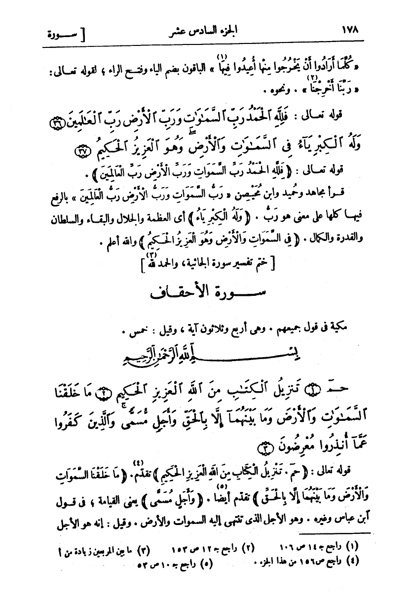 حم (١) تَنْزِيلُ الْكِتابِ مِنَ اللَّهِ الْعَزِيزِ الْحَكِيمِ (٢) مَا خَلَقْنَا السَّماواتِ وَالْأَرْضَ وَما بَيْنَهُما إِلاَّ بِالْحَقِّ وَأَجَلٍ مُسَمًّى وَالَّذِينَ كَفَرُوا عَمَّا أُنْذِرُوا مُعْرِضُونَ (٣)