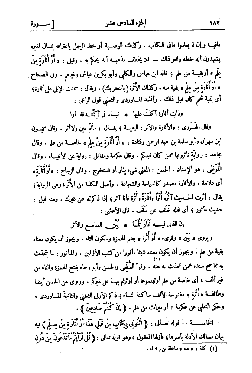 وَقَالَ الْهَرَوِيُّ: وَالْأَثَارَةُ وَالْأَثَرُ: الْبَقِيَّةُ، يُقَالُ: مَا ثَمَّ عَيْنٌ وَلَا أَثَرٌ. وَقَالَ مَيْمُونُ بْنُ مِهْرَانَ وَأَبُو سَلَمَةَ بْنُ عَبْدِ الرَّحْمَنِ وَقَتَادَةُ:" أَوْ أَثارَةٍ مِنْ عِلْمٍ" خَاصَّةً مِنْ عِلْمٍ. وَقَالَ مُجَاهِدٌ: رِوَايَةٌ تَأْثُرُونَهَا عَمَّنْ كَانَ قَبْلَكُمْ. وَقَالَ عِكْرِمَةُ وَمُقَاتِلٌ: رِوَايَةٌ عَنِ الْأَنْبِيَاءِ. وَقَالَ الْقُرَظِيُّ: هُوَ الْإِسْنَادُ. الْحَسَنُ: الْمَعْنَى شَيْءٌ يُثَارُ أَوْ يُسْتَخْرَجُ. وَقَالَ الزَّجَّاجُ:" أَوْ أَثارَةٍ" أَيْ عَلَامَةٍ. وَالْأَثَارَةُ مَصْدَرٌ كَالسَّمَاحَةِ وَالشَّجَاعَةِ. وَأَصْلُ الْكَلِمَةِ مِنَ الْأَثَرِ، وَهِيَ الرِّوَايَةُ، يُقَالُ: أَثَرْتُ الْحَدِيثَ آثُرُهُ أَثْرًا وَأَثَارَةً وَأُثْرَةً فَأَنَا آثِرٌ، إِذَا ذَكَرْتُهُ عَنْ غَيْرِكَ. وَمِنْهُ قِيلَ: حَدِيثٌ مَأْثُورٌ، أَيْ نَقَلَهُ خَلَفٌ عَنْ سَلَفٍ. قَالَ الْأَعْشَى: