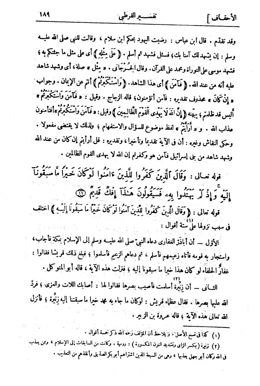 قَوْلُهُ تَعَالَى:" وَقالَ الَّذِينَ كَفَرُوا لِلَّذِينَ آمَنُوا لَوْ كانَ خَيْراً مَا سَبَقُونا إِلَيْهِ" اخْتُلِفَ فِي سَبَبِ نُزُولِهَا عَلَى سِتَّةِ «١» أَقْوَالٍ: الْأَوَّلُ- أَنَّ أَبَا ذَرٍّ الْغِفَارِيَّ دَعَاهُ النَّبِيُّ صَلَّى اللَّهُ عَلَيْهِ وَسَلَّمَ إِلَى الْإِسْلَامِ بِمَكَّةَ فَأَجَابَ، وَاسْتَجَارَ بِهِ قَوْمُهُ فَأَتَاهُ زَعِيمُهُمْ فَأَسْلَمَ، ثُمَّ دَعَاهُمُ الزَّعِيمُ فَأَسْلَمُوا، فَبَلَغَ ذَلِكَ قُرَيْشًا فَقَالُوا: غِفَارٌ الْحُلَفَاءُ لَوْ كَانَ هَذَا خَيْرًا مَا سَبَقُونَا إِلَيْهِ، فَنَزَلَتْ هَذِهِ الْآيَةُ، قَالَهُ أَبُو الْمُتَوَكِّلِ. الثَّانِي- أَنَّ زِنِّيرَةَ «٢» أَسْلَمَتْ فَأُصِيبَ بَصَرُهَا فَقَالُوا لَهَا: أَصَابَكِ اللَّاتُ وَالْعُزَّى، فَرَدَّ اللَّهُ عَلَيْهَا بَصَرَهَا. فَقَالَ عُظَمَاءُ قُرَيْشٍ: لَوْ كَانَ مَا جَاءَ بِهِ مُحَمَّدٌ خَيْرًا مَا سَبَقَتْنَا إِلَيْهِ زِنِّيرَةُ، فَأَنْزَلَ اللَّهُ تَعَالَى هَذِهِ الْآيَةَ، قَالَهُ عُرْوَةُ بن الزبير.