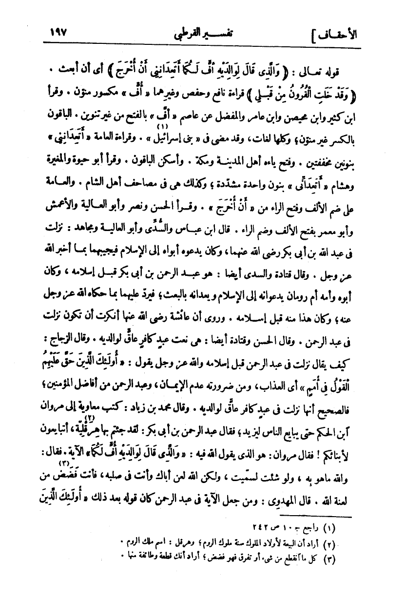قَوْلُهُ تَعَالَى:" وَالَّذِي قالَ لِوالِدَيْهِ أُفٍّ لَكُما أَتَعِدانِنِي أَنْ أُخْرَجَ" أَيْ أَنْ أُبْعَثَ." وَقَدْ خَلَتِ الْقُرُونُ مِنْ قَبْلِي" قِرَاءَةُ نَافِعٍ وَحَفْصٍ وَغَيْرِهِمَا" أُفٍّ" مَكْسُورٌ مُنَوَّنٌ. وَقَرَأَ ابْنُ كَثِيرٍ وَابْنُ مُحَيْصِنٍ وَابْنُ عَامِرٍ وَالْمُفَضَّلُ عَنْ عَاصِمٍ" أُفٍّ" بِالْفَتْحِ مِنْ غَيْرِ تَنْوِينٍ. الْبَاقُونَ بِالْكَسْرِ غَيْرِ مُنَوَّنٍ، وَكُلُّهَا لُغَاتٌ، وَقَدْ مَضَى فِي" بَنِي إِسْرَائِيلَ" «١». وَقِرَاءَةُ الْعَامَّةِ" أَتَعِدانِنِي" بِنُونَيْنِ مُخَفَّفَتَيْنِ. وَفَتَحَ يَاءَهُ أَهْلُ الْمَدِينَةِ وَمَكَّةَ. وَأَسْكَنَ الْبَاقُونَ. وَقَرَأَ أَبُو حَيْوَةَ وَالْمُغِيرَةُ وَهِشَامٌ" أَتَعِدَانِّي" بِنُونٍ وَاحِدَةٍ مُشَدَّدَةٍ، وَكَذَلِكَ هِيَ فِي مَصَاحِفِ أَهْلِ الشَّامِ. وَالْعَامَّةُ عَلَى ضَمِّ الْأَلِفِ وَفَتْحِ الرَّاءِ مِنْ" أَنْ أُخْرَجَ". وَقَرَأَ الْحَسَنُ وَنَصْرٌ وَأَبُو الْعَالِيَةِ وَالْأَعْمَشُ وَأَبُو مَعْمَرٍ بِفَتْحِ الْأَلِفِ وَضَمِّ الرَّاءِ. قَالَ ابْنُ عَبَّاسٍ وَالسُّدِّيُّ وَأَبُو الْعَالِيَةِ وَمُجَاهِدٌ: نَزَلَتْ فِي عَبْدِ اللَّهِ بْنِ أَبِي بَكْرٍ رَضِيَ اللَّهُ عَنْهُمَا، وَكَانَ يَدْعُوهُ أَبَوَاهُ إِلَى الْإِسْلَامِ فَيُجِيبُهُمَا بِمَا أَخْبَرَ اللَّهُ عَزَّ وَجَلَّ. وَقَالَ قَتَادَةُ وَالسُّدِّيُّ أَيْضًا: هُوَ عَبْدُ الرَّحْمَنِ بْنُ أَبِي بَكْرٍ قَبْلَ إِسْلَامِهِ، وَكَانَ أَبُوهُ وَأُمُّهُ أُمُّ رُومَانَ يَدْعُوَانِهِ إِلَى الْإِسْلَامِ وَيَعِدَانِهِ بِالْبَعْثِ، فَيَرُدُّ عَلَيْهِمَا بِمَا حَكَاهُ اللَّهُ عَزَّ وَجَلَّ عَنْهُ، وَكَانَ هَذَا مِنْهُ قَبْلَ إِسْلَامِهِ. وَرُوِيَ أَنَّ عَائِشَةَ رَضِيَ اللَّهُ عَنْهَا أَنْكَرَتْ أَنْ تَكُونَ نَزَلَتْ فِي عَبْدِ الرَّحْمَنِ. وَقَالَ الْحَسَنُ وَقَتَادَةُ أَيْضًا: هِيَ نَعْتُ عَبْدٍ كَافِرٍ عَاقٍّ لِوَالِدَيْهِ. وَقَالَ الزَّجَّاجُ: كَيْفَ يُقَالُ نَزَلَتْ فِي عَبْدِ الرَّحْمَنِ قَبْلَ إِسْلَامِهِ وَاللَّهُ عَزَّ وَجَلَّ يَقُولُ:" أُولئِكَ الَّذِينَ حَقَّ عَلَيْهِمُ الْقَوْلُ فِي أُمَمٍ" أَيِ الْعَذَابُ، وَمِنْ ضَرُورَتِهِ عَدَمُ الْإِيمَانِ، وَعَبْدُ الرَّحْمَنِ مِنْ أَفَاضِلِ الْمُؤْمِنِينَ، فَالصَّحِيحُ أَنَّهَا نَزَلَتْ فِي عَبْدٍ كَافِرٍ عَاقٍّ لِوَالِدَيْهِ. وَقَالَ مُحَمَّدُ بْنُ زِيَادٍ: كَتَبَ مُعَاوِيَةُ إلى مروان ابن الْحَكَمِ حَتَّى يُبَايِعَ النَّاسَ لِيَزِيدَ، فَقَالَ عَبْدُ الرَّحْمَنِ بْنُ أَبِي بَكْرٍ: لَقَدْ جِئْتُمْ بِهَا هِرَقْلِيَّةَ «٢»، أَتُبَايِعُونَ لِأَبْنَائِكُمْ! فَقَالَ مَرْوَانُ: هُوَ الَّذِي يَقُولُ اللَّهُ فِيهِ" وَالَّذِي قالَ لِوالِدَيْهِ أُفٍّ لَكُما" الْآيَةَ. فَقَالَ: وَاللَّهِ مَا هُوَ بِهِ. وَلَوْ شِئْتُ لَسَمَّيْتُ، وَلَكِنَّ اللَّهَ لَعَنَ أَبَاكَ وَأَنْتَ فِي صُلْبِهِ، فَأَنْتَ فَضَضٌ «٣» مِنْ لَعْنَةِ اللَّهِ. قَالَ الْمَهْدَوِيُّ: وَمَنْ جَعَلَ الْآيَةَ فِي عَبْدِ الرَّحْمَنِ كَانَ قَوْلُهُ بَعْدَ ذَلِكَ" أُولئِكَ الَّذِينَ حَقَّ عَلَيْهِمُ الْقَوْلُ"