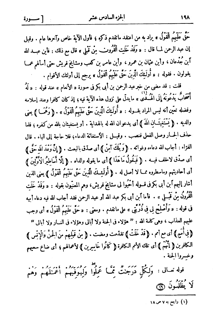 يُرَادُ بِهِ مَنِ اعْتَقَدَ مَا تَقَدَّمَ ذِكْرُهُ، فَأَوَّلُ الْآيَةِ خَاصٌّ وَآخِرُهَا عَامٌّ. وَقِيلَ: إِنَّ عَبْدَ الرَّحْمَنِ لَمَّا قَالَ" وَقَدْ خَلَتِ الْقُرُونُ مِنْ قَبْلِي" قَالَ مَعَ ذَلِكَ: فَأَيْنَ عَبْدُ الله ابن جُدْعَانَ، وَأَيْنَ عُثْمَانُ بْنُ عَمْرٍو، وَأَيْنَ عَامِرُ بْنُ كَعْبٍ وَمَشَايِخُ قُرَيْشٍ حَتَّى أَسْأَلَهُمْ عَمَّا يَقُولُونَ. فَقَوْلُهُ" أُولئِكَ الَّذِينَ حَقَّ عَلَيْهِمُ الْقَوْلُ" يَرْجِعُ إِلَى أُولَئِكَ الْأَقْوَامِ. قُلْتُ: قَدْ مَضَى مِنْ خَبَرِ عَبْدِ الرَّحْمَنِ بْنِ أَبِي بَكْرٍ فِي سُورَةِ (الْأَنْعَامِ) عِنْدَ قَوْلِهِ" لَهُ أَصْحابٌ يَدْعُونَهُ إِلَى الْهُدَى" «١» [الانعام: ٧١] مَا يَدُلُّ عَلَى نُزُولِ هَذِهِ الْآيَةِ فِيهِ، إِذْ كَانَ كَافِرًا وَعِنْدَ إِسْلَامِهِ وَفَضْلِهِ تَعَيَّنَ أَنَّهُ لَيْسَ الْمُرَادُ بِقَوْلِهِ" أُولَئِكَ الَّذِينَ حَقَّ عَلَيْهِمُ الْقَوْلُ"." وَهُما" يَعْنِي وَالِدَيْهِ." يَسْتَغِيثانِ اللَّهَ" أَيْ يَدْعُوَانِ اللَّهَ لَهُ بِالْهِدَايَةِ. أَوْ يَسْتَغِيثَانِ بِاللَّهِ مِنْ كُفْرِهِ، فَلَمَّا حَذَفَ الْجَارَّ وَصَلَ الْفِعْلَ فَنُصِبَ. وَقِيلَ: الِاسْتِغَاثَةُ الدُّعَاءُ، فَلَا حَاجَةَ إِلَى الْبَاءِ. قَالَ الْفَرَّاءُ: أَجَابَ اللَّهُ دُعَاءَهُ وَغُوَاثَهُ." وَيْلَكَ آمِنْ" أَيْ صَدِّقْ بِالْبَعْثِ." إِنَّ وَعْدَ اللَّهِ حَقٌّ" أَيْ صِدْقٌ لَا خُلْفَ فِيهِ." فَيَقُولُ مَا هَذَا" أَيْ مَا يَقُولُهُ وَالِدَاهُ." إِلَّا أَساطِيرُ الْأَوَّلِينَ" أَيْ أَحَادِيثَهُمْ وَمَا سَطَرُوهُ مِمَّا لَا أَصْلَ لَهُ." أُولئِكَ الَّذِينَ حَقَّ عَلَيْهِمُ الْقَوْلُ" يَعْنِي الَّذِينَ أَشَارَ إِلَيْهِمُ ابْنُ أَبِي بَكْرٍ فِي قَوْلِهِ أَحْيُوا لِي مَشَايِخَ قُرَيْشٍ، وَهُمُ الْمَعْنِيُّونَ بِقَوْلِهِ" وَقَدْ خَلَتِ الْقُرُونُ مِنْ قَبْلِي". فَأَمَّا ابْنُ أَبِي بَكْرٍ عَبْدُ اللَّهِ أَوْ عَبْدُ الرَّحْمَنِ فَقَدْ أَجَابَ اللَّهُ فِيهِ دُعَاءَ أَبِيهِ فِي قَوْلِهِ" وَأَصْلِحْ لِي فِي ذُرِّيَّتِي" [الأحقاف: ١٥] على ما تقدم. ومعنى" حَقَّ عَلَيْهِمُ الْقَوْلُ" أَيْ، وَجَبَ عَلَيْهِمُ الْعَذَابُ، وَهِيَ كَلِمَةُ اللَّهِ:] هَؤُلَاءِ فِي الْجَنَّةِ وَلَا أُبَالِي وَهَؤُلَاءِ فِي النَّارِ وَلَا أُبَالِي [." فِي أُمَمٍ" أي مع أمم" قَدْ خَلَتْ" تقدمت ومضت." مِنْ قَبْلِهِمْ مِنَ الْجِنِّ وَالْإِنْسِ" الْكَافِرِينَ" إِنَّهُمْ" أَيْ تِلْكَ الْأُمَمُ الْكَافِرَةُ" كانُوا خاسِرِينَ" لِأَعْمَالِهِمْ، أَيْ ضَاعَ سعيهم وخسروا الجنة.