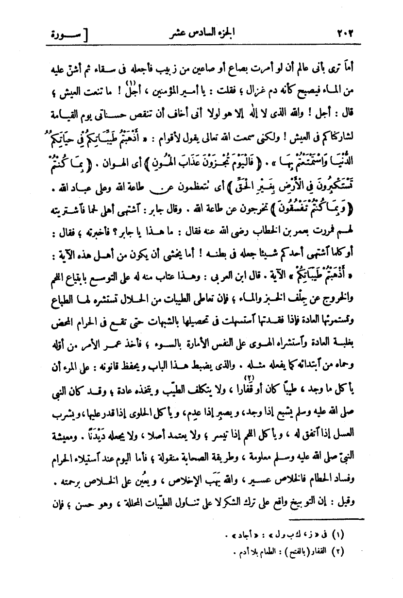 أَمَا تَرَى بِأَنِّي عَالِمٌ أَنْ لَوْ أَمَرْتُ بِصَاعٍ أَوْ صَاعَيْنِ مِنْ زَبِيبٍ فَأَجْعَلُهُ فِي سِقَاءٍ ثُمَّ أَشُنُّ عَلَيْهِ مِنَ الْمَاءِ فَيُصْبِحُ كَأَنَّهُ دَمُ غَزَالٍ، فَقُلْتُ: يَا أَمِيرَ الْمُؤْمِنِينَ، أَجَلْ «١»! مَا تَنْعَتُ الْعَيْشَ، قَالَ: أَجَلْ! وَاللَّهُ الَّذِي لَا إِلَهَ إِلَّا هُوَ لَوْلَا أَنِّي أَخَافُ أَنْ تَنْقُصَ حَسَنَاتِي يَوْمَ الْقِيَامَةِ لَشَارَكْنَاكُمْ فِي الْعَيْشِ! وَلَكِنِّي سَمِعْتُ اللَّهَ تَعَالَى يَقُولُ لِأَقْوَامٍ: أَذْهَبْتُمْ طَيِّباتِكُمْ فِي حَياتِكُمُ الدُّنْيا وَاسْتَمْتَعْتُمْ بِها"." فَالْيَوْمَ تُجْزَوْنَ عَذابَ الْهُونِ" أَيِ الْهَوَانُ." بِما كُنْتُمْ تَسْتَكْبِرُونَ فِي الْأَرْضِ بِغَيْرِ الْحَقِّ" أَيْ تَتَعَظَّمُونَ عَنْ طَاعَةِ اللَّهِ وَعَلَى عِبَادِ اللَّهِ." وَبِما كُنْتُمْ تَفْسُقُونَ" تَخْرُجُونَ عَنْ طَاعَةِ اللَّهِ. وَقَالَ جَابِرٌ: اشْتَهَى أَهْلِي لَحْمًا فَاشْتَرَيْتُهُ لَهُمْ فَمَرَرْتُ بِعُمَرَ بْنِ الْخَطَّابِ رَضِيَ اللَّهُ عَنْهُ فَقَالَ: مَا هَذَا يَا جَابِرُ؟ فَأَخْبَرْتُهُ، فقال: أو كلما اشْتَهَى أَحَدُكُمْ شَيْئًا جَعَلَهُ فِي بَطْنِهِ! أَمَا يَخْشَى أَنْ يَكُونَ مِنْ أَهْلِ هَذِهِ الْآيَةِ:" أَذْهَبْتُمْ طَيِّباتِكُمْ" الْآيَةَ. قَالَ ابْنُ الْعَرَبِيِّ: وَهَذَا عِتَابٌ مِنْهُ لَهُ عَلَى التَّوَسُّعِ بِابْتِيَاعِ اللَّحْمِ وَالْخُرُوجِ عَنْ جِلْفِ الْخُبْزِ وَالْمَاءِ، فَإِنَّ تَعَاطِيَ الطَّيِّبَاتِ مِنَ الْحَلَالِ تَسْتَشْرِهُ لَهَا الطِّبَاعُ وَتَسْتَمْرِئُهَا الْعَادَةُ فَإِذَا فَقَدَتْهَا اسْتَسْهَلْتَ فِي تَحْصِيلِهَا بِالشُّبُهَاتِ حَتَّى تَقَعَ فِي الْحَرَامِ الْمَحْضِ بِغَلَبَةِ الْعَادَةِ وَاسْتِشْرَاهِ الْهَوَى عَلَى النَّفْسِ الْأَمَّارَةِ بِالسُّوءِ، فَأَخَذَ عُمَرُ الْأَمْرَ مِنْ أَوَّلِهِ وَحَمَاهُ مِنَ ابْتِدَائِهِ كَمَا يَفْعَلُهُ مِثْلُهُ. وَالَّذِي يَضْبِطُ هَذَا الْبَابَ وَيَحْفَظُ قَانُونَهُ: عَلَى الْمَرْءِ أَنْ يَأْكُلَ مَا وَجَدَ، طَيِّبًا كَانَ أَوْ قَفَارًا «٢»، وَلَا يَتَكَلَّفُ الطَّيِّبَ وَيَتَّخِذُهُ عَادَةً، وَقَدْ كَانَ النَّبِيُّ صَلَّى اللَّهُ عَلَيْهِ وَسَلَّمَ يَشْبَعُ إِذَا وَجَدَ، وَيَصْبِرُ إِذَا عَدِمَ، وَيَأْكُلُ الْحَلْوَى إِذَا قَدَرَ عَلَيْهَا، وَيَشْرَبُ الْعَسَلَ إِذَا اتَّفَقَ لَهُ، وَيَأْكُلُ اللَّحْمَ إذا تيسر، ولا يعتمده أَصْلًا، وَلَا يَجْعَلُهُ دَيْدَنًا. وَمَعِيشَةُ النَّبِيِّ صَلَّى اللَّهُ عَلَيْهِ وَسَلَّمَ مَعْلُومَةٌ، وَطَرِيقَةُ الصَّحَابَةِ مَنْقُولَةٌ، فَأَمَّا الْيَوْمُ عِنْدَ اسْتِيلَاءِ الْحَرَامِ وَفَسَادِ الْحُطَامِ فَالْخَلَاصُ عَسِيرٌ، وَاللَّهُ يَهَبُ الْإِخْلَاصَ، وَيُعِينُ عَلَى الْخَلَاصِ بِرَحْمَتِهِ. وَقِيلَ: إِنَّ التَّوْبِيخَ وَاقِعٌ عَلَى تَرْكِ الشُّكْرِ لَا عَلَى تَنَاوُلِ الطَّيِّبَاتِ الْمُحَلَّلَةِ، وهو حسن، فإن