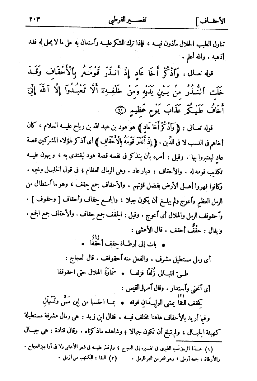 قَوْلُهُ تَعَالَى:" وَاذْكُرْ أَخا عادٍ" هُوَ هُودُ بْنُ عَبْدِ اللَّهِ بْنِ رَبَاحِ عَلَيْهِ السَّلَامُ، كَانَ أَخَاهُمْ فِي النَّسَبِ لَا فِي الدِّينِ." إِذْ أَنْذَرَ قَوْمَهُ بِالْأَحْقافِ" أَيِ اذْكُرْ لِهَؤُلَاءِ الْمُشْرِكِينَ قِصَّةَ عَادٍ لِيَعْتَبِرُوا بِهَا. وَقِيلَ: أَمَرَهُ بِأَنْ يَتَذَكَّرَ فِي نَفْسِهِ قِصَّةَ هُودٍ لِيَقْتَدِيَ بِهِ، وَيُهَوِّنَ عَلَيْهِ تَكْذِيبَ قَوْمِهِ لَهُ. وَالْأَحْقَافُ: دِيَارُ عَادٍ. وَهِيَ الرِّمَالُ الْعِظَامُ، فِي قَوْلِ الْخَلِيلِ وَغَيْرِهِ. وَكَانُوا قَهَرُوا أَهْلَ الْأَرْضِ بِفَضْلِ قُوَّتِهِمْ. وَالْأَحْقَافُ جَمْعُ حِقْفٍ، وَهُوَ مَا اسْتَطَالَ مِنَ الرَّمْلِ الْعَظِيمِ وَاعْوَجَّ وَلَمْ يَبْلُغْ أَنْ يَكُونَ جَبَلًا، وَالْجَمْعُ حِقَافٌ وَأَحْقَافٌ] وَحُقُوفٌ [. وَاحْقَوْقَفَ الرَّمْلُ وَالْهِلَالُ أَيِ اعْوَجَّ. وَقِيلَ: الْحِقْفُ جَمَعُ حِقَافٌ. وَالْأَحْقَافُ جَمْعُ الْجَمْعِ. وَيُقَالُ: حِقْفٌ أَحْقَفُ. قَالَ الْأَعْشَى: