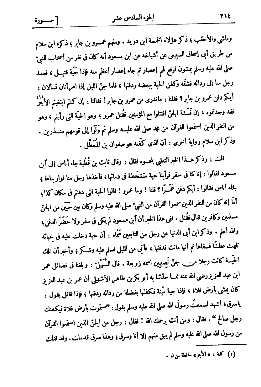 وَمَاشِي وَالْأَحْقَبُ، ذَكَرَ هَؤُلَاءِ الْخَمْسَةَ ابْنُ دُرَيْدٍ. وَمِنْهُمْ عَمْرُو بْنُ جَابِرٍ، ذَكَرَهُ ابْنُ سَلَّامٍ مِنْ طَرِيقِ أَبِي إِسْحَاقَ السَّبِيعِيِّ عَنْ أَشْيَاخِهِ عَنِ ابْنِ مَسْعُودَ أَنَّهُ كَانَ فِي نَفَرٌ مِنْ أَصْحَابِ النَّبِيِّ صَلَّى اللَّهُ عَلَيْهِ وَسَلَّمَ يَمْشُونَ فَرُفِعَ لَهُمْ إِعْصَارٌ ثُمَّ جَاءَ إِعْصَارٌ أَعْظَمُ مِنْهُ فَإِذَا حَيَّةُ قَتِيلٍ، فَعَمَدَ رَجُلٌ مِنَّا إِلَى رِدَائِهِ فَشَقَّهُ وَكَفَّنَ الْحَيَّةَ بِبَعْضِهِ وَدَفَنَهَا، فَلَمَّا جَنَّ اللَّيْلُ إِذَا امْرَأَتَانِ تَسْأَلَانِ: أَيُّكُمْ دَفَنَ عَمْرَو بْنَ جَابِرٍ؟ فَقُلْنَا: مَا نَدْرِي مَنْ عَمْرُو بْنُ جَابِرٍ! فَقَالَتَا: إِنْ كُنْتُمُ ابْتَغَيْتُمُ الْأَجْرَ «١» فَقَدْ وَجَدْتُمُوهُ، إِنَّ فَسَقَةَ الْجِنِّ اقْتَتَلُوا مَعَ الْمُؤْمِنِينَ فَقُتِلَ عَمْرٌو، وَهُوَ الْحَيَّةُ الَّتِي رَأَيْتُمْ، وَهُوَ مِنَ النَّفَرِ الَّذِينَ اسْتَمَعُوا الْقُرْآنَ مِنْ مُحَمَّدٍ صَلَّى اللَّهُ عَلَيْهِ وَسَلَّمَ ثُمَّ وَلَّوْا إِلَى قَوْمِهِمْ مُنْذِرِينَ. وَذَكَرَ ابْنُ سَلَّامٍ رِوَايَةٌ أُخْرَى: أَنَّ الَّذِي كَفَّنَهُ هُوَ صَفْوَانُ بْنُ الْمُعَطَّلِ. قُلْتُ: وَذَكَرَ هَذَا الْخَبَرَ الثَّعْلَبِيُّ بِنَحْوِهِ فَقَالَ: وَقَالَ ثَابِتُ بْنُ قُطْبَةَ جَاءَ أُنَاسٌ إِلَى ابْنِ مَسْعُودٍ فَقَالُوا: إنا كنا في سقر فَرَأَيْنَا حَيَّةً مُتَشَحِّطَةً فِي دِمَائِهَا، فَأَخَذَهَا رَجُلٌ مِنَّا فَوَارَيْنَاهَا، فَجَاءَ أُنَاسٌ فَقَالُوا: أَيُّكُمْ دَفَنَ عَمْرًا؟ قُلْنَا: وَمَا عَمْرٌو! قَالُوا الْحَيَّةُ الَّتِي دَفَنْتُمْ فِي مَكَانِ كَذَا، أَمَا إِنَّهُ كَانَ مِنَ النَّفَرِ الَّذِينَ سَمِعُوا الْقُرْآنَ مِنَ النَّبِيِّ صَلَّى اللَّهُ عَلَيْهِ وَسَلَّمَ وَكَانَ بَيْنَ حَيَّيْنِ مِنَ الْجِنِّ مُسْلِمِينَ وَكَافِرِينَ قِتَالٌ فَقُتِلَ. فَفِي هَذَا الْخَبَرِ أَنَّ ابْنَ مَسْعُودٍ لَمْ يَكُنْ فِي سَفَرٍ وَلَا حَضَرَ الدَّفْنَ، وَاللَّهُ أَعْلَمُ. وَذَكَرَ ابْنُ أَبِي الدُّنْيَا عَنْ رَجُلٍ مِنَ التَّابِعِينَ سَمَّاهُ: أَنَّ حَيَّةً دَخَلَتْ عَلَيْهِ فِي خِبَائِهِ تَلْهَثُ عَطَشًا فَسَقَاهَا ثُمَّ أَنَّهَا مَاتَتْ فَدَفَنَهَا، فَأُتِيَ مِنَ اللَّيْلِ فَسُلِّمَ عَلَيْهِ وَشُكِرَ، وأخبر أن تلك الحية كانت رجلا عن جِنِّ نَصِيبِينَ اسْمُهُ زَوْبَعَةُ. قَالَ السُّهَيْلِيُّ: وَبَلَغَنَا في فضائل عمر ابن عَبْدِ الْعَزِيزِ رَضِيَ اللَّهُ عَنْهُ مِمَّا حَدَّثَنَا بِهِ أَبُو بَكْرِ بْنُ طَاهِرٍ الْأَشْبِيلِيُّ أَنَّ عُمَرَ بْنَ عَبْدِ الْعَزِيزِ كَانَ يَمْشِي بِأَرْضٍ فَلَاةٍ، فَإِذَا حَيَّةٌ مَيِّتَةٌ فَكَفَّنَهَا بِفَضْلَةٍ مِنْ رِدَائِهِ وَدَفَنَهَا، فَإِذَا قَائِلٌ يَقُولُ: يَا سُرَّقُ، أَشْهَدُ لَسَمِعْتُ رَسُولَ اللَّهِ صَلَّى اللَّهُ عَلَيْهِ وَسَلَّمَ يَقُولُ:] سَتَمُوتُ بِأَرْضٍ فَلَاةٍ فَيُكَفِّنُكَ رَجُلٌ صَالِحٌ [. فَقَالَ: وَمَنْ أَنْتَ يَرْحَمُكَ اللَّهُ! فَقَالَ: رَجُلٌ مِنَ الْجِنِّ الَّذِينَ اسْتَمَعُوا الْقُرْآنَ مِنْ رَسُولِ اللَّهِ صَلَّى اللَّهُ عَلَيْهِ وَسَلَّمَ لم يَبْقَ مِنْهُمْ إِلَّا أَنَا وَسُرَّقٌ، وَهَذَا سُرَّقٌ قد مات. وقد قتلت