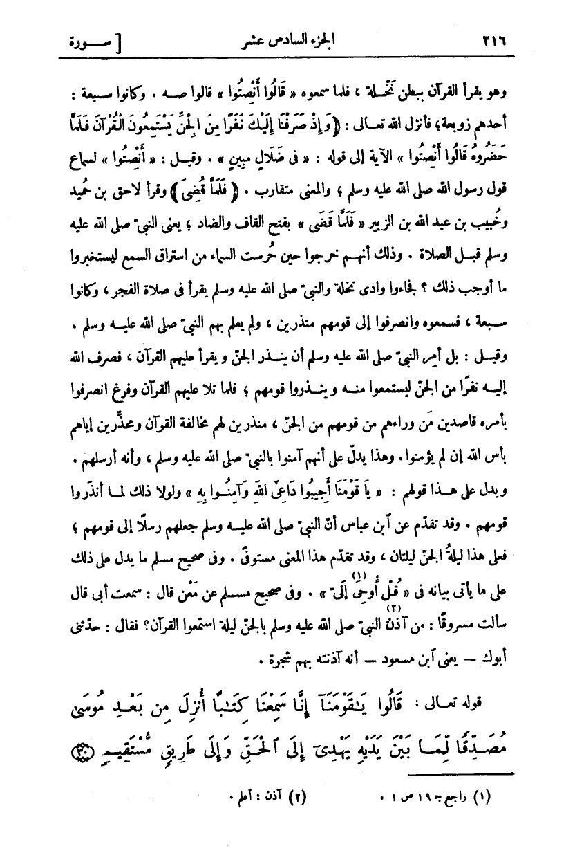 وَهُوَ يَقْرَأُ الْقُرْآنَ بِبَطْنِ نَخْلَةَ، فَلَمَّا سَمِعُوهُ" قالُوا أَنْصِتُوا" قَالُوا صَهٍ. وَكَانُوا سَبْعَةً: أَحَدُهُمْ زَوْبَعَةُ، فَأَنْزَلَ اللَّهُ تَعَالَى:" وَإِذْ صَرَفْنا إِلَيْكَ نَفَراً مِنَ الْجِنِّ يَسْتَمِعُونَ الْقُرْآنَ فَلَمَّا حَضَرُوهُ قالُوا أَنْصِتُوا" الْآيَةَ إِلَى قَوْلِهِ:" فِي ضَلالٍ مُبِينٍ" [الأحقاف: ٣٢]. وَقِيلَ:" أَنْصِتُوا" لِسَمَاعِ قَوْلِ رَسُولِ اللَّهِ صَلَّى اللَّهُ عَلَيْهِ وَسَلَّمَ، وَالْمَعْنَى مُتَقَارِبٌ." فَلَمَّا قُضِيَ" وَقَرَأَ لَاحِقُ بْنُ حُمَيْدٍ وَخُبَيْبُ بْنُ عَبْدِ اللَّهِ بْنِ الزُّبَيْرِ" فَلَمَّا قُضِيَ" بِفَتْحِ الْقَافِ وَالضَّادِ، يَعْنِي النَّبِيُّ صَلَّى اللَّهُ عَلَيْهِ وَسَلَّمَ قَبْلَ الصَّلَاةِ. وَذَلِكَ أَنَّهُمْ خَرَجُوا حِينَ حُرِسَتِ السَّمَاءُ مِنَ اسْتِرَاقِ السَّمْعِ لِيَسْتَخْبِرُوا مَا أَوْجَبَ ذَلِكَ؟ فَجَاءُوا وَادِي نَخْلَةِ وَالنَّبِيُّ صَلَّى اللَّهُ عَلَيْهِ وَسَلَّمَ يَقْرَأُ فِي صَلَاةِ الْفَجْرِ، وَكَانُوا سَبْعَةً، فَسَمِعُوهُ وَانْصَرَفُوا إِلَى قَوْمِهِمْ مُنْذِرِينَ، وَلَمْ يَعْلَمْ بِهِمُ النَّبِيُّ صَلَّى اللَّهُ عَلَيْهِ وَسَلَّمَ. وَقِيلَ: بَلْ أَمَرَ النَّبِيَّ صَلَّى اللَّهُ عَلَيْهِ وَسَلَّمَ أَنْ يُنْذِرَ الْجِنَّ وَيَقْرَأَ عَلَيْهِمُ الْقُرْآنَ، فَصَرَفَ اللَّهُ إِلَيْهِ نَفَرًا مِنَ الْجِنِّ لِيَسْتَمِعُوا مِنْهُ وَيُنْذِرُوا قَوْمَهُمْ، فَلَمَّا تَلَا عَلَيْهِمُ الْقُرْآنَ وَفَرَغَ انْصَرَفُوا بِأَمْرِهِ قَاصِدِينَ مَنْ وَرَاءَهُمْ مِنْ قَوْمِهِمْ مِنَ الْجِنِّ، مُنْذِرِينَ لَهُمْ مُخَالَفَةَ الْقُرْآنِ وَمُحَذِّرِينَ إِيَّاهُمْ بَأْسَ اللَّهِ إِنْ لَمْ يُؤْمِنُوا. وَهَذَا يَدُلُّ عَلَى أَنَّهُمْ آمَنُوا بِالنَّبِيِّ صَلَّى اللَّهُ عَلَيْهِ وَسَلَّمَ، وَأَنَّهُ أَرْسَلَهُمْ. وَيَدُلُّ عَلَى هذا قولهم:" يَا قَوْمَنا أَجِيبُوا داعِيَ اللَّهِ وَآمِنُوا بِهِ" [الأحقاف: ٣١] وَلَوْلَا ذَلِكَ لَمَا أَنْذَرُوا قَوْمَهُمْ. وَقَدْ تَقَدَّمَ عَنِ ابْنِ عَبَّاسٍ أَنَّ النَّبِيَّ صَلَّى اللَّهُ عَلَيْهِ وَسَلَّمَ جَعَلَهُمْ رُسُلًا إِلَى قَوْمِهِمْ، فَعَلَى هَذَا لَيْلَةُ الْجِنِّ لَيْلَتَانِ، وَقَدْ تَقَدَّمَ هَذَا الْمَعْنَى مُسْتَوْفًى. وَفِي صَحِيحِ مُسْلِمٍ مَا يَدُلُّ عَلَى ذَلِكَ عَلَى مَا يَأْتِي بَيَانُهُ فِي" قُلْ أُوحِيَ إِلَيَّ" «١» [الجن: ١]. وَفِي صَحِيحِ مُسْلِمٍ عَنْ مَعْنٍ قَالَ: سَمِعْتُ أَبِي قَالَ سَأَلْتُ مَسْرُوقًا مَنْ آذَنَ «٢» النَّبِيَّ صَلَّى اللَّهُ عَلَيْهِ وَسَلَّمَ بِالْجِنِّ لَيْلَةَ اسْتَمَعُوا الْقُرْآنَ؟ فَقَالَ: حَدَّثَنِي أَبُوكَ- يَعْنِي ابْنُ مَسْعُودٍ- أنه آذنته بهم شجرة.